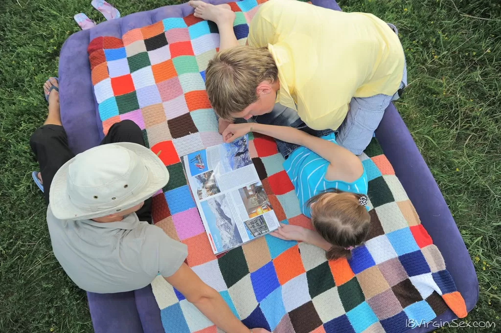 18-летняя девственница прикалывается над членом перед двойным проникновением на одеяле на открытом воздухе