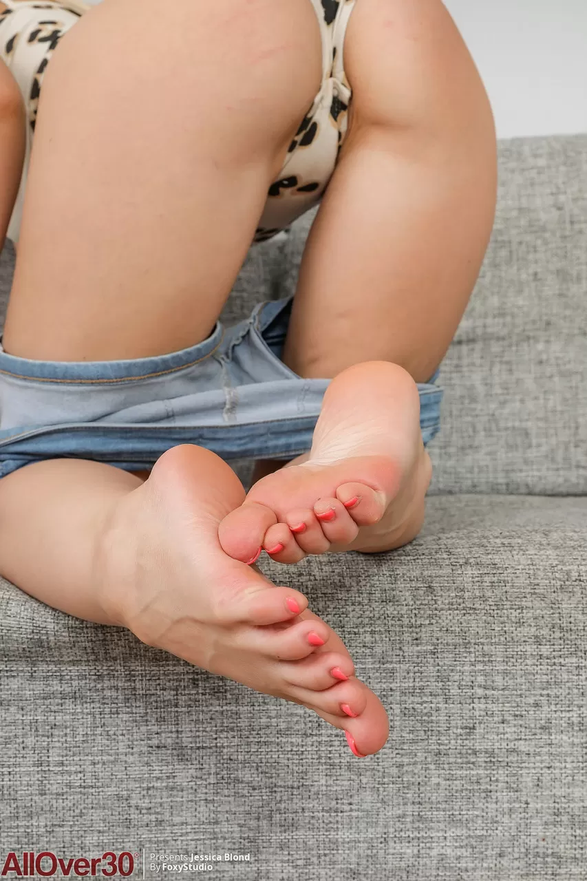 30-летняя грязная блондинка Джессика Блонд дрочит свою киску дилдо после того, как разделась догола