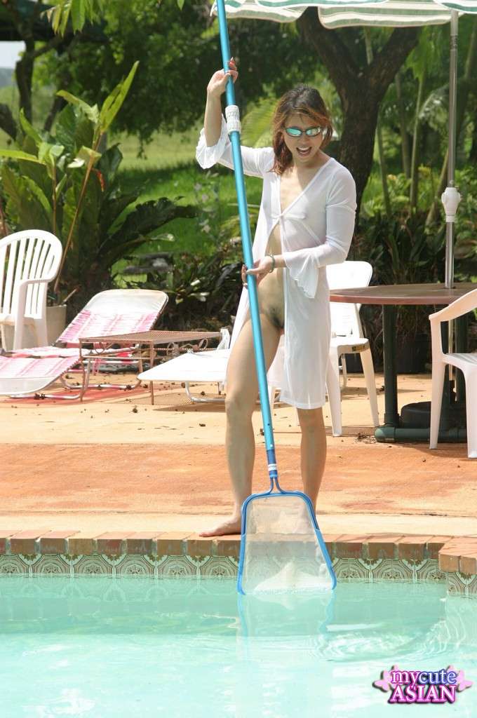 Азиатская любительница выплевывает сперму после секса из киски в рот на бортике бассейна