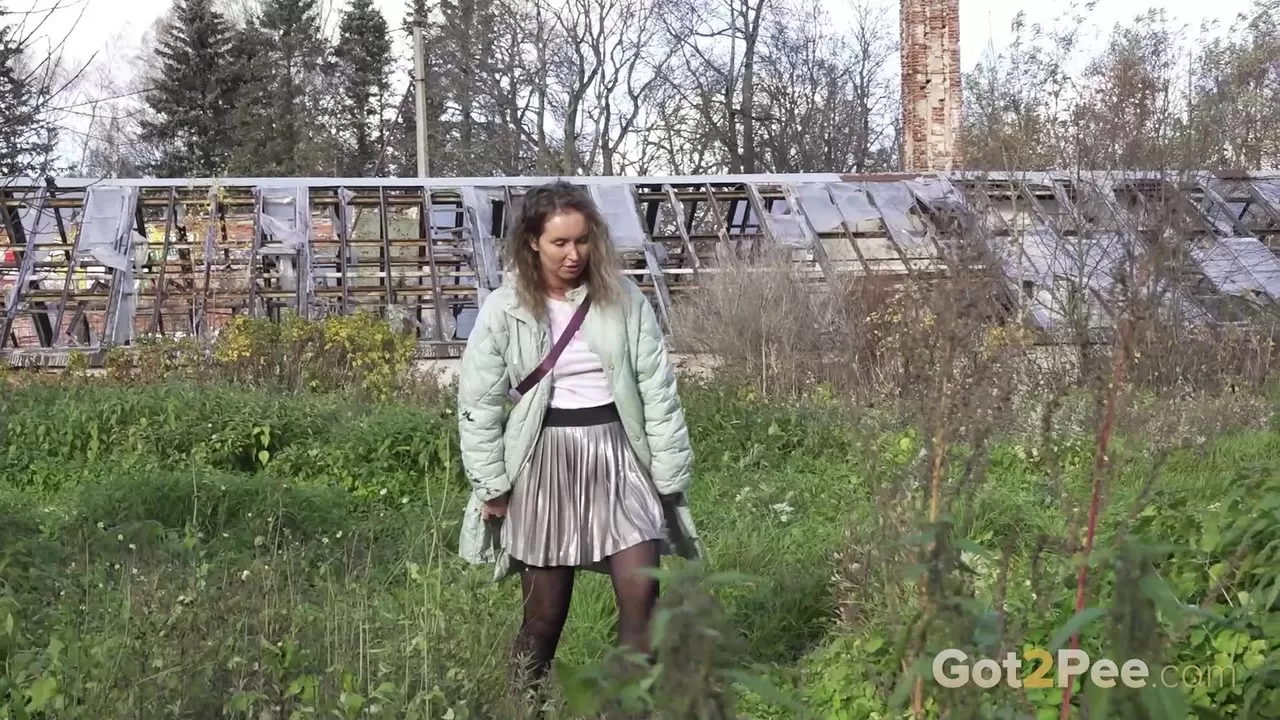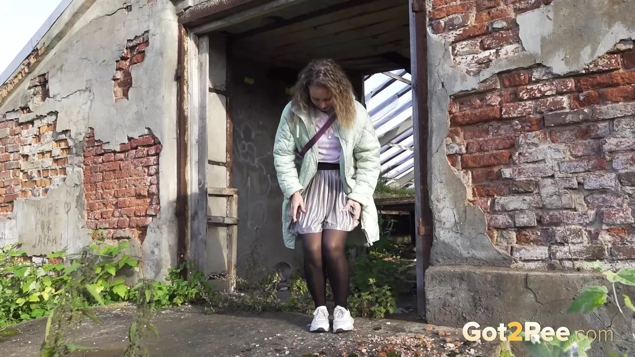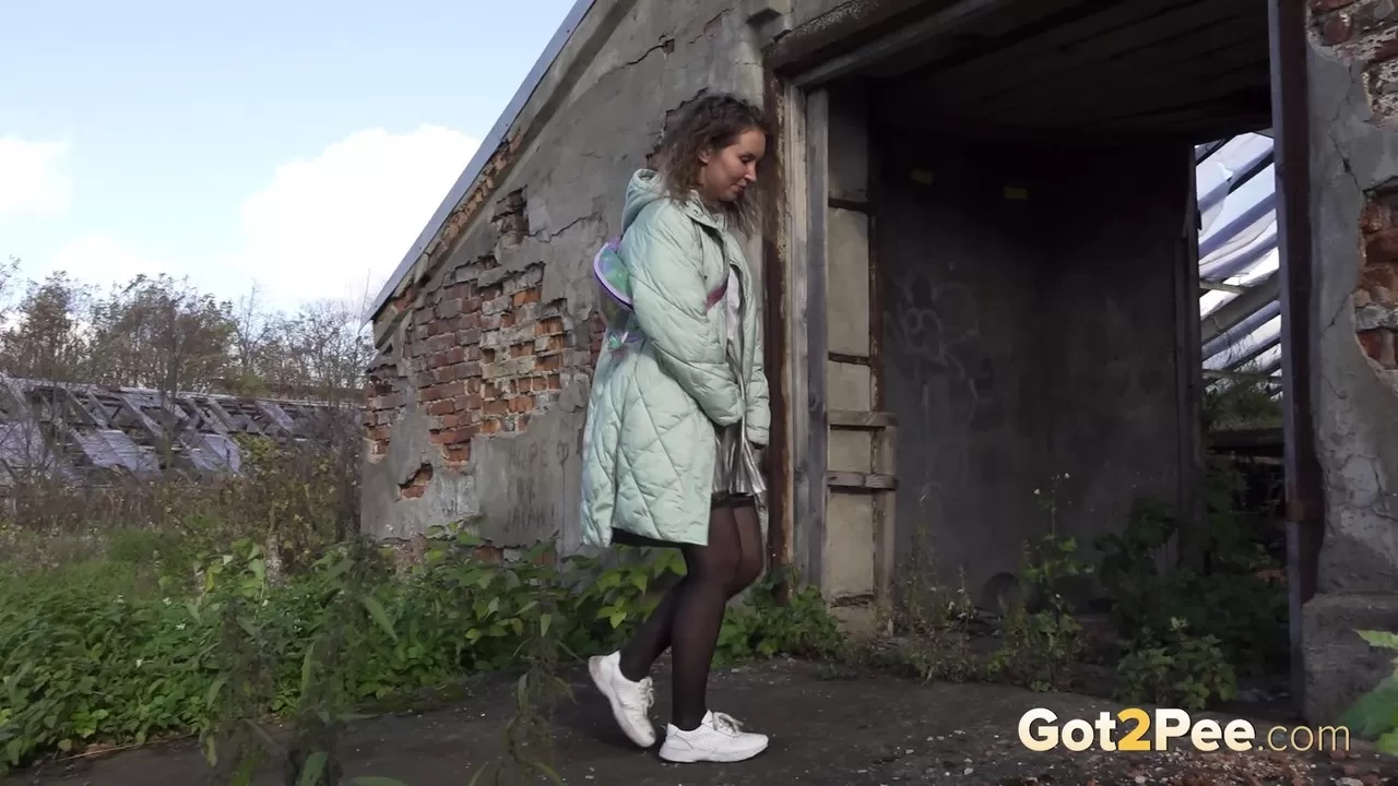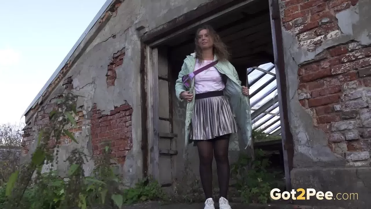 Белая девушка Рита мочится у заброшенного здания, срезая путь