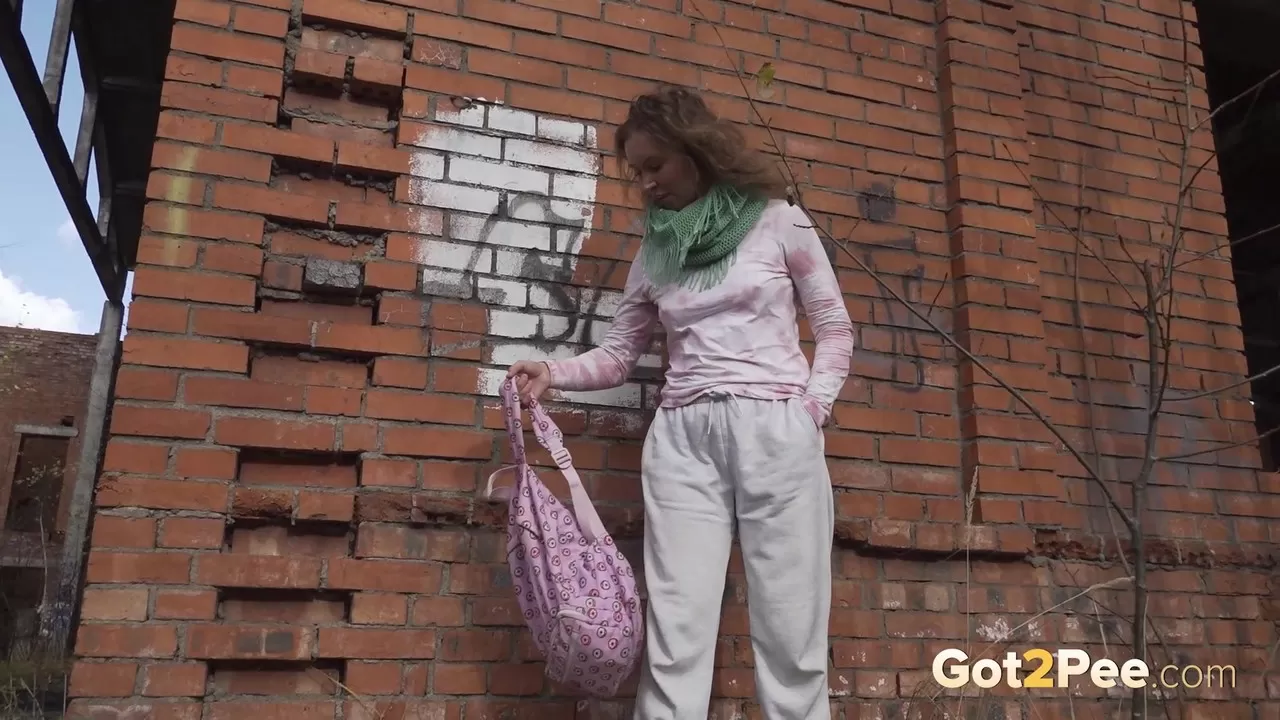 Белая девушка Рита отходит в туалет за заброшенным кирпичным зданием