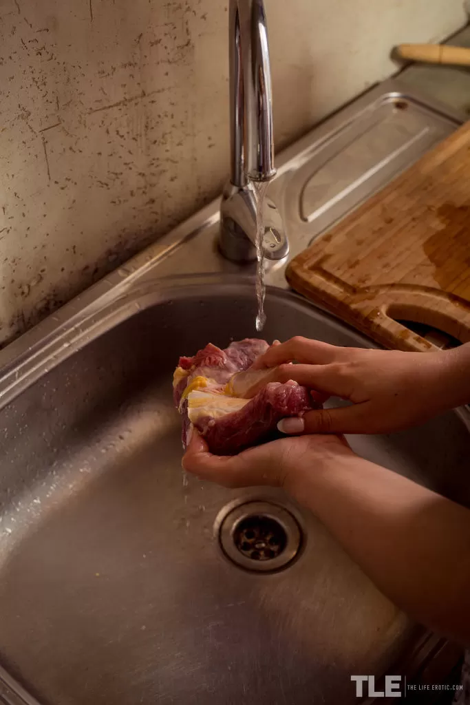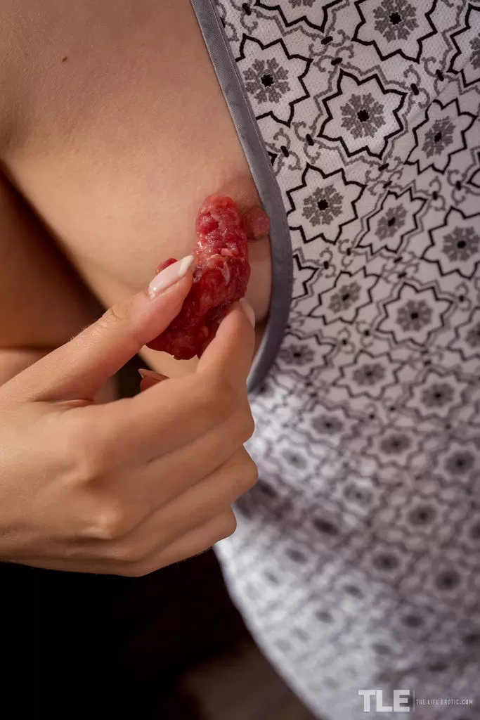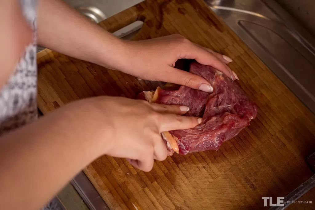 Блондинка Эльза А мастурбирует после разделки стейка в кухонном фартуке
