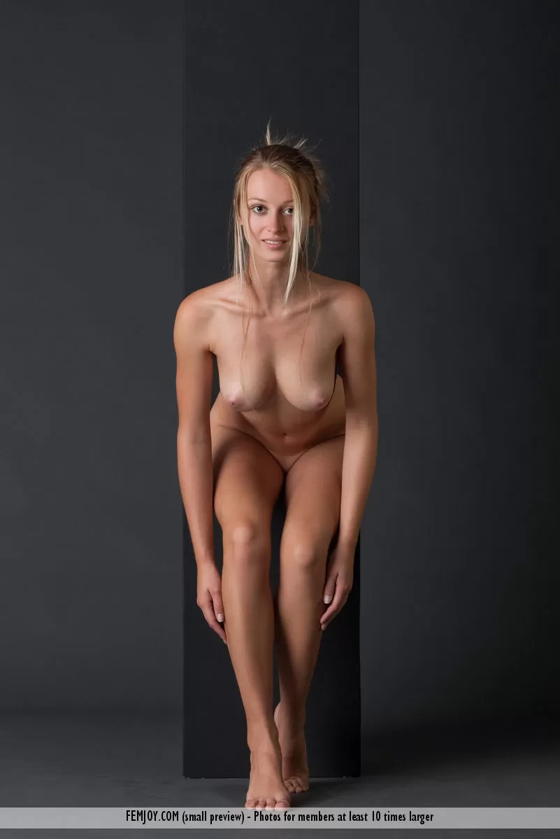 Блондинка-одиночка с упругими сиськами и голыми ножками щиплет себя за сосок в обнаженном виде