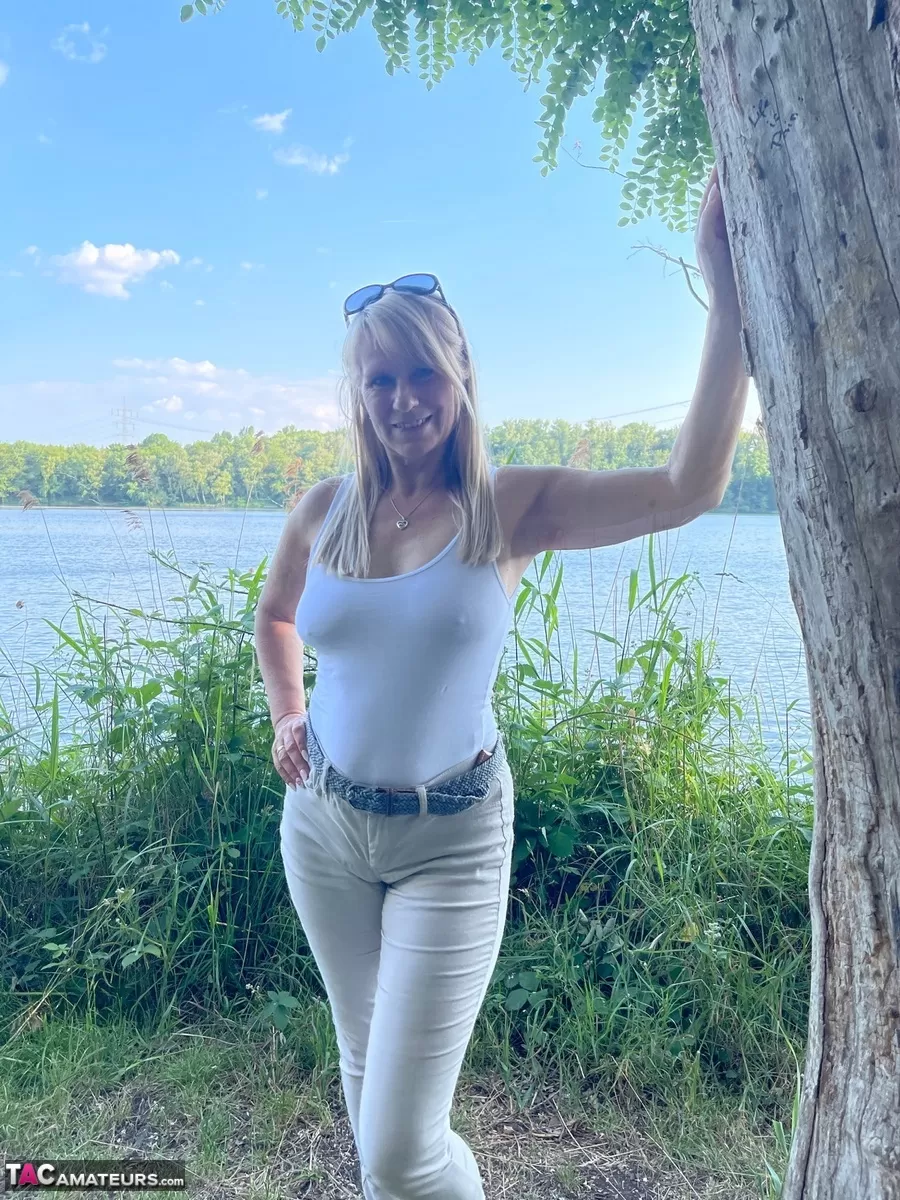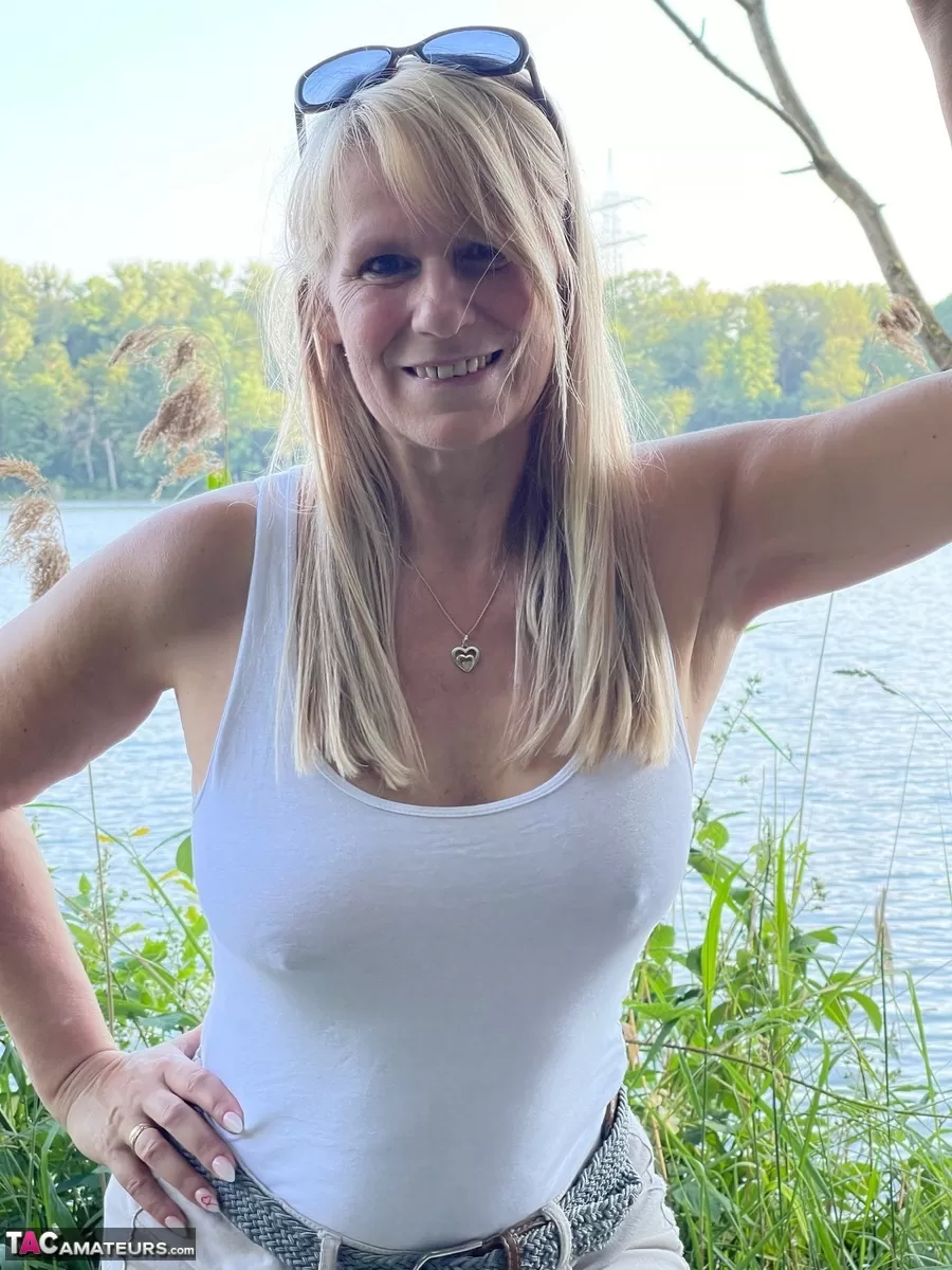 Блондинка средних лет Сладкая Сьюзи пальчиком раздвигает свою киску во время активного отдыха