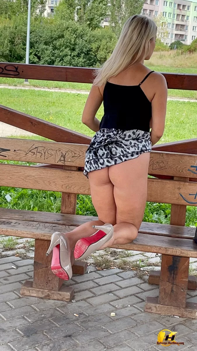 Большегрудая блондинка Катерина Хартлова мастурбирует на общественной скамейке на каблуках