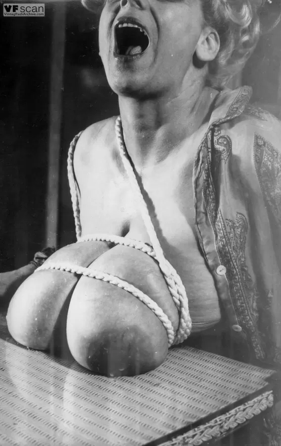 Большие груди связывают и разбрызгивают молоко в похабной винтажной сцене БДСМ