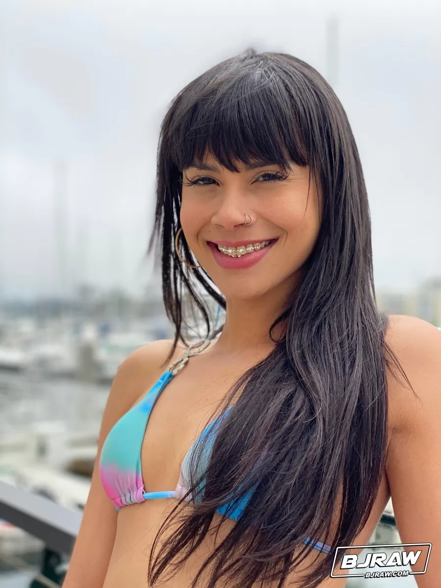 Брюнетка Ари Алектра моделирует на пристани для яхт перед минетом от первого лица с поеданием задницы