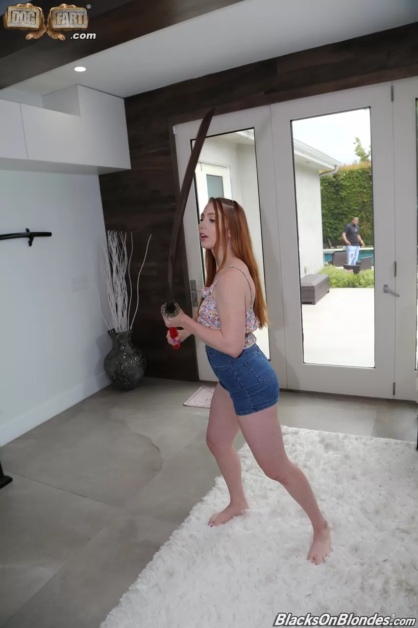 Длинноногая рыжеволосая девушка впервые испытывает свой большой черный член на диване в гостиной