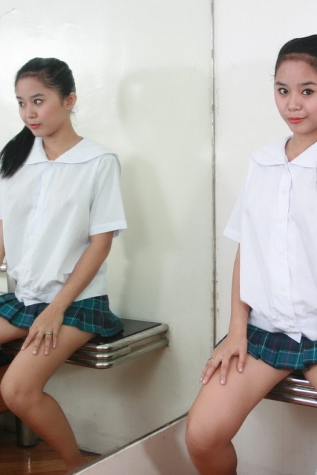 Едва законнорожденная азиатская школьница с полной грудью демонстрирует свою киску на кровати
