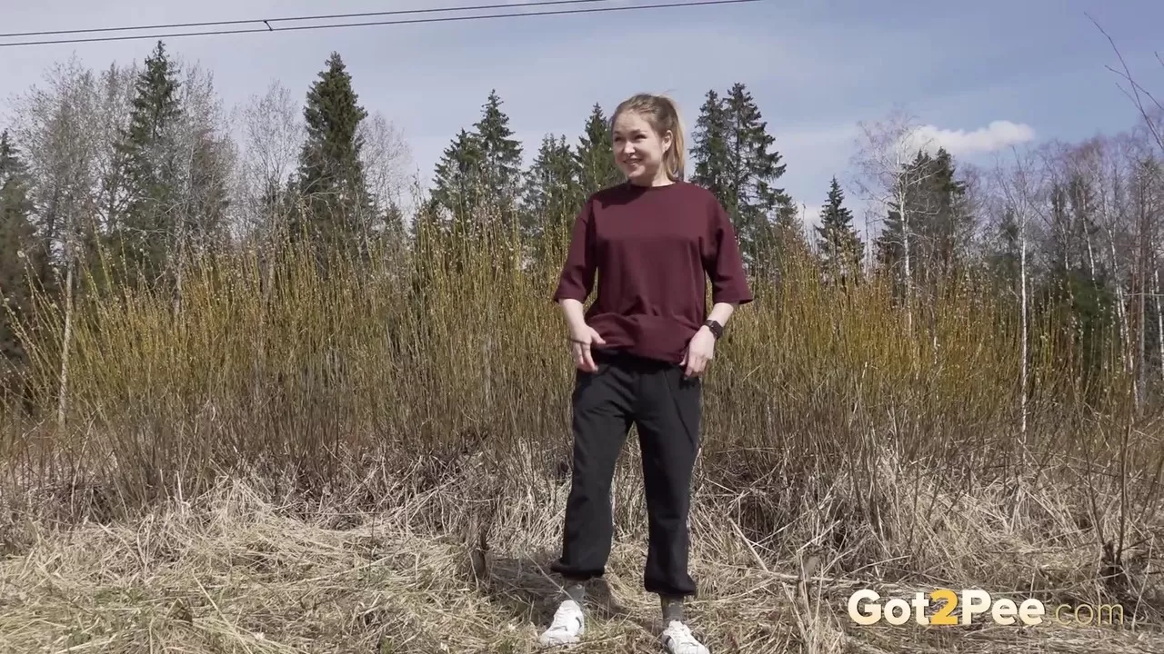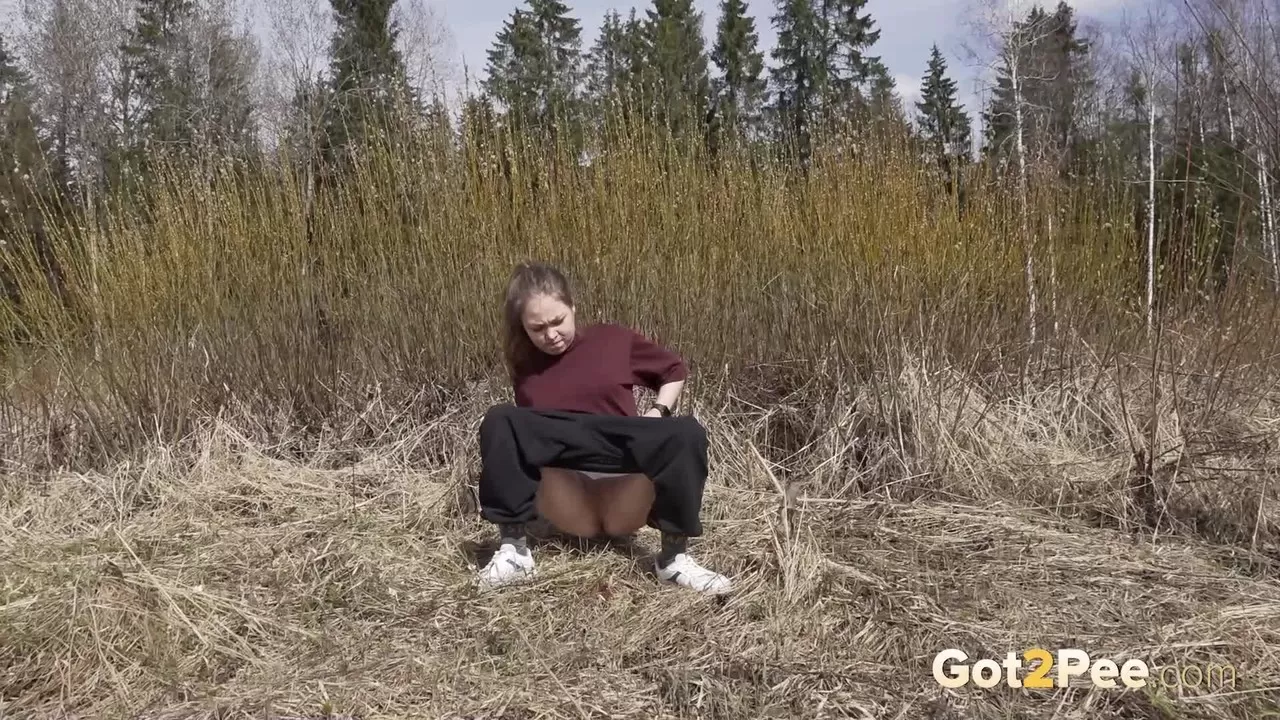 Европейская красотка садится на корточки на пустыре, чтобы пописать