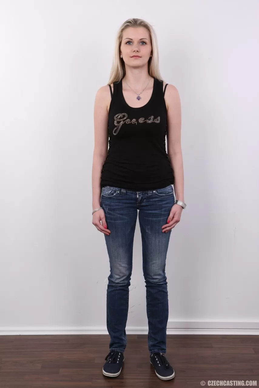 Голубоглазая блондинка-любительница раздевается догола для съемок порно-интервью с кулаком