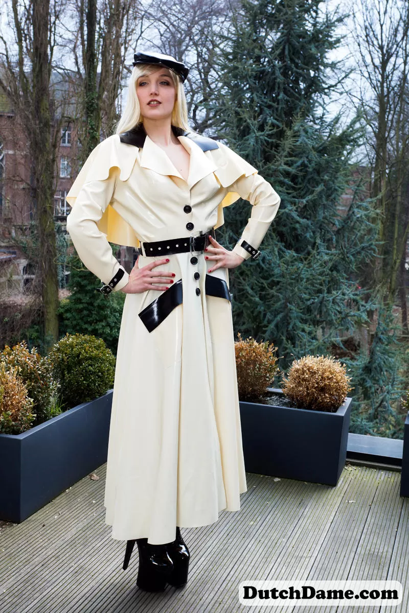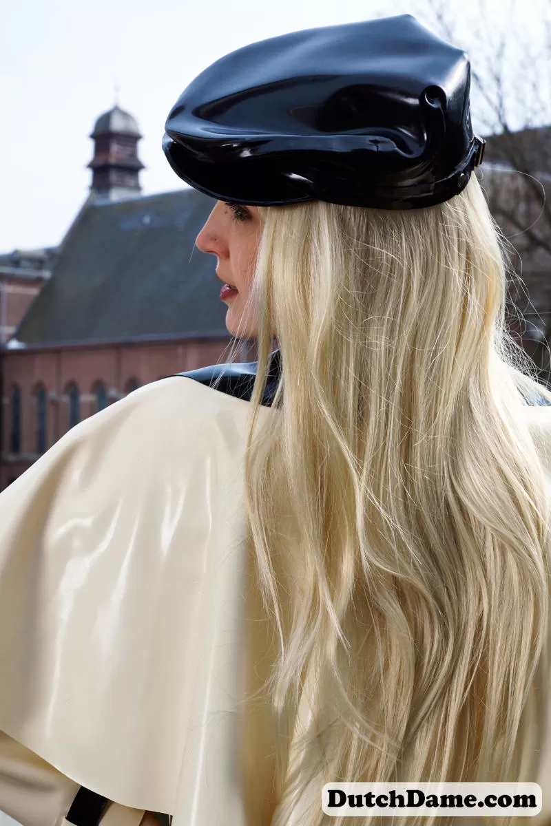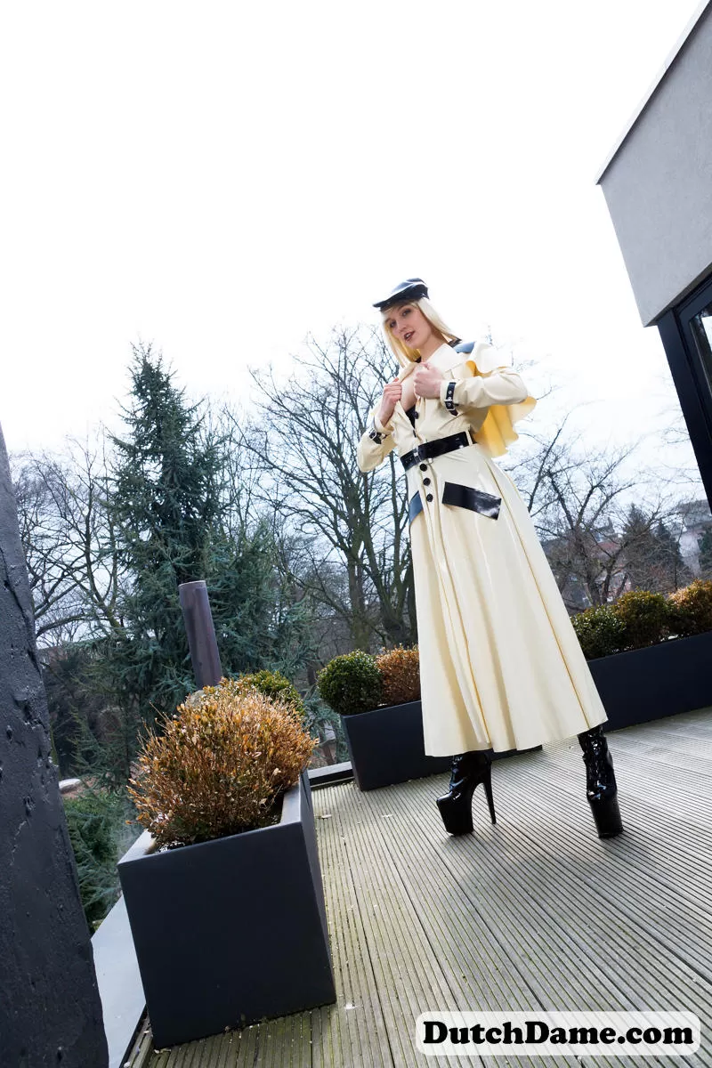 Горячая блондинка сверкает латексными подвязками, моделируя на открытом воздухе в резиновом наряде