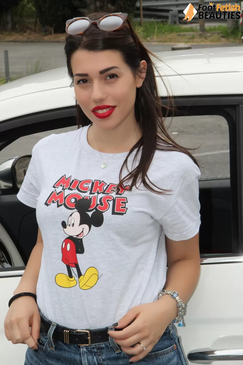 Горячая девушка демонстрирует свои сексуальные ножки в машине, одетая в футболку с Микки Маусом