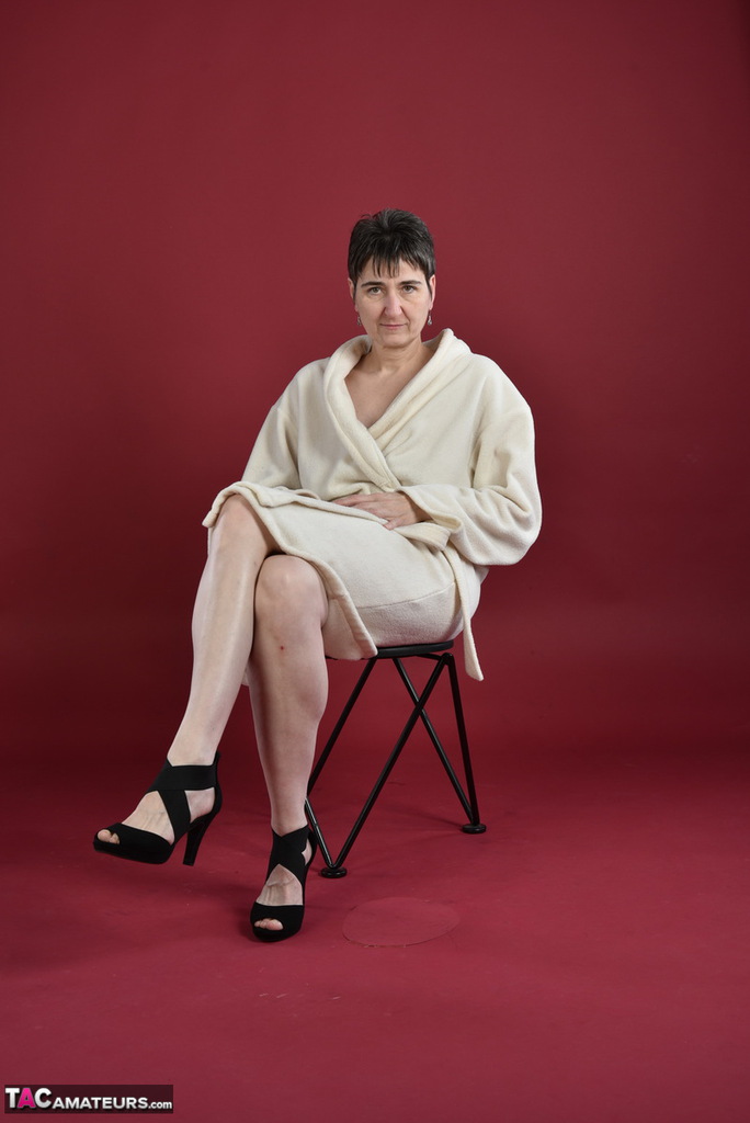 Горячая мамаша-любительская модель освобождает свои ноги от каблуков, прежде чем расстегнуть халат
