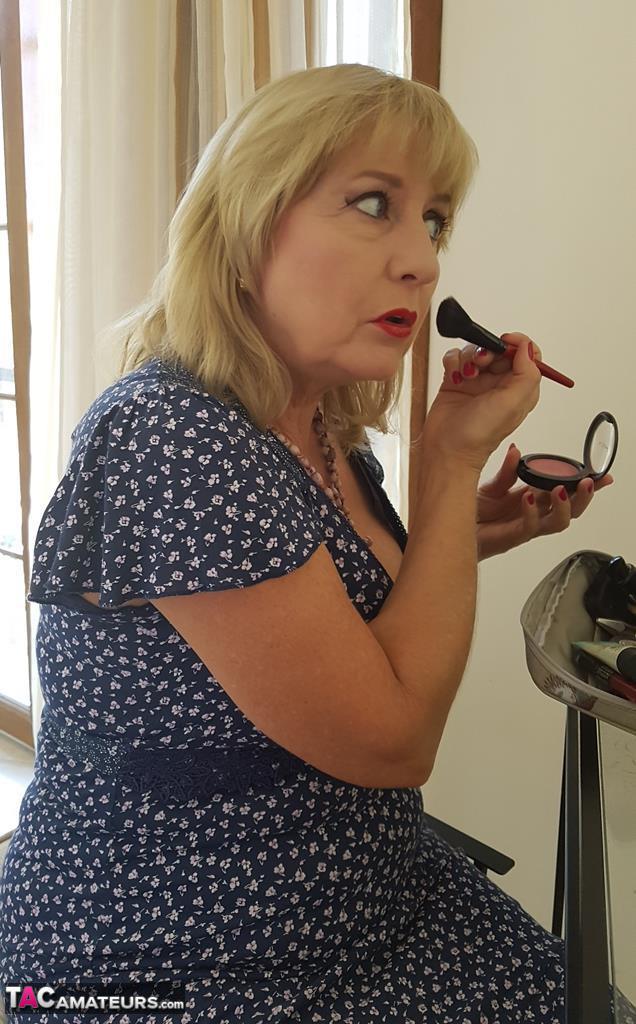 Горячая зрелая блондинка Лорна Блу в рваных колготках встает на колени, чтобы потереть киску