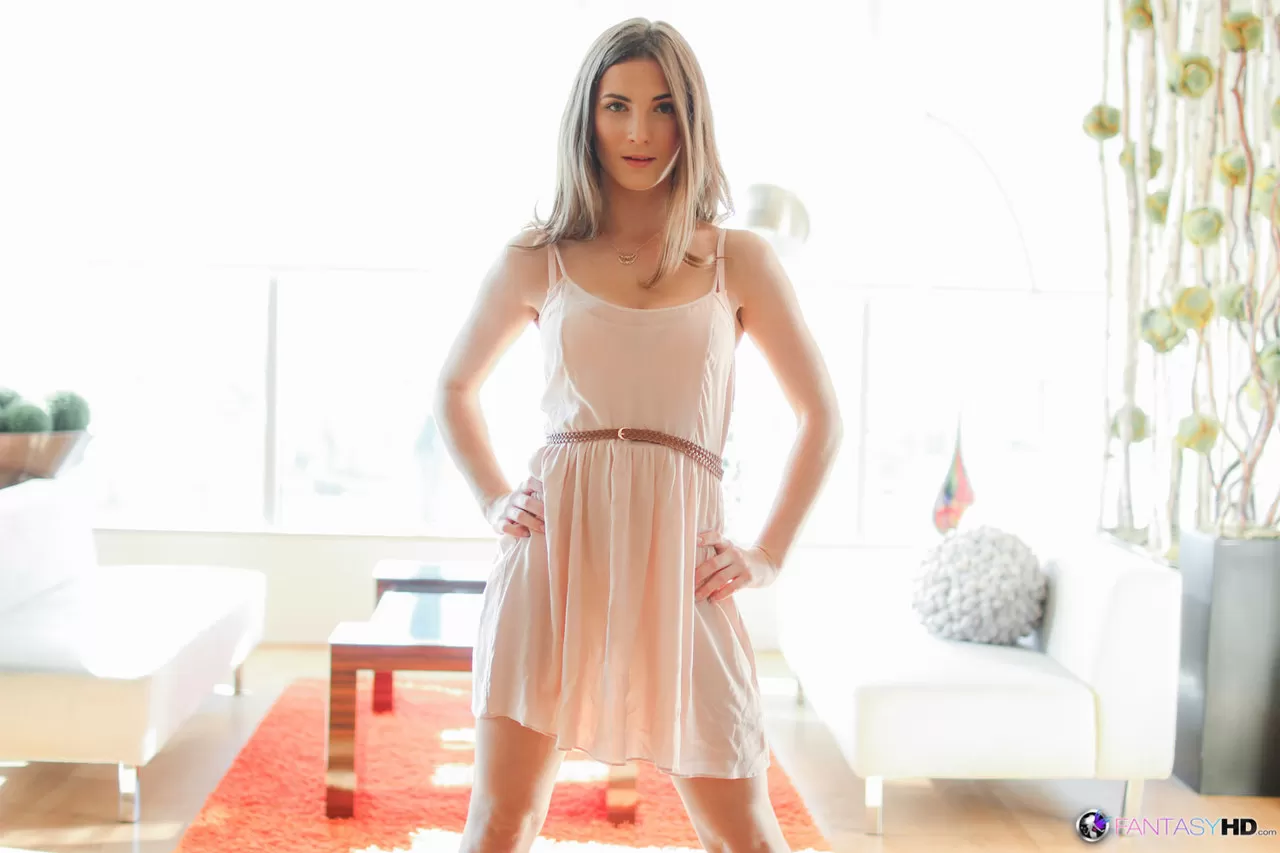 Грудастая белая молоденькая держится за свои покрытые спермой сиськи после траха длинным членом