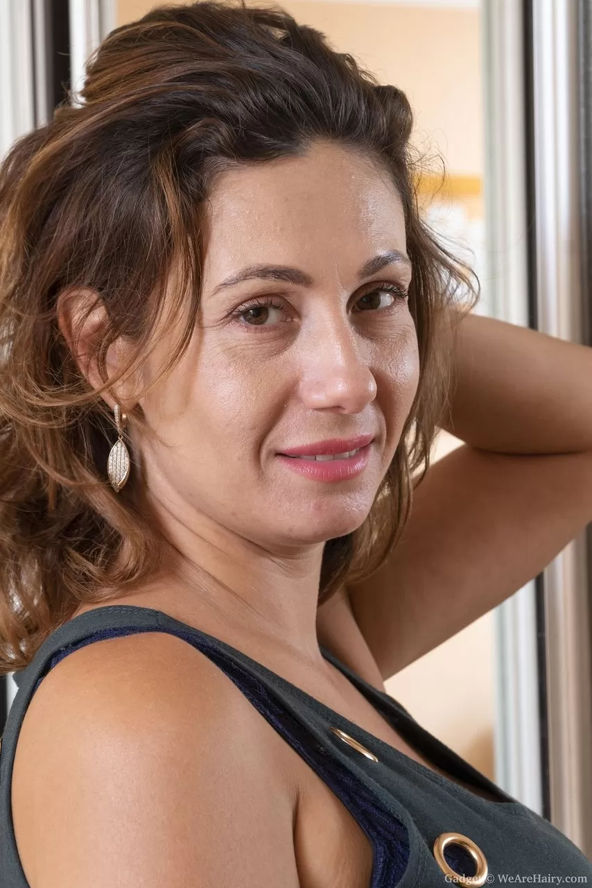 Грудастая любительница Гаджета показывает свою волосатую киску крупным планом в обнаженном виде