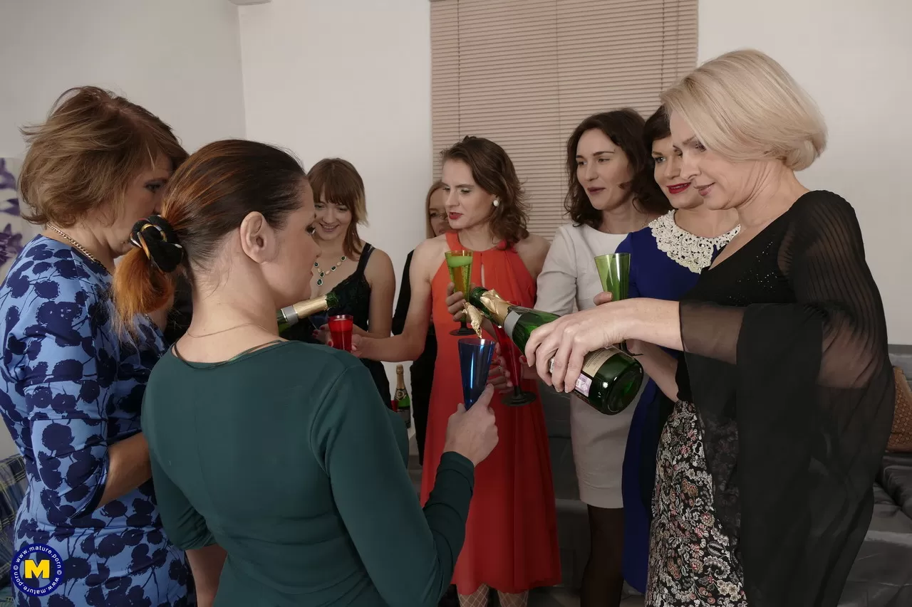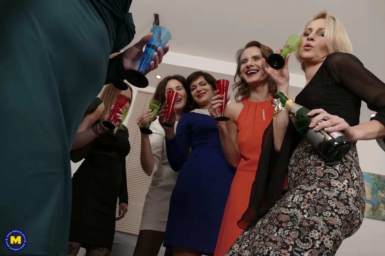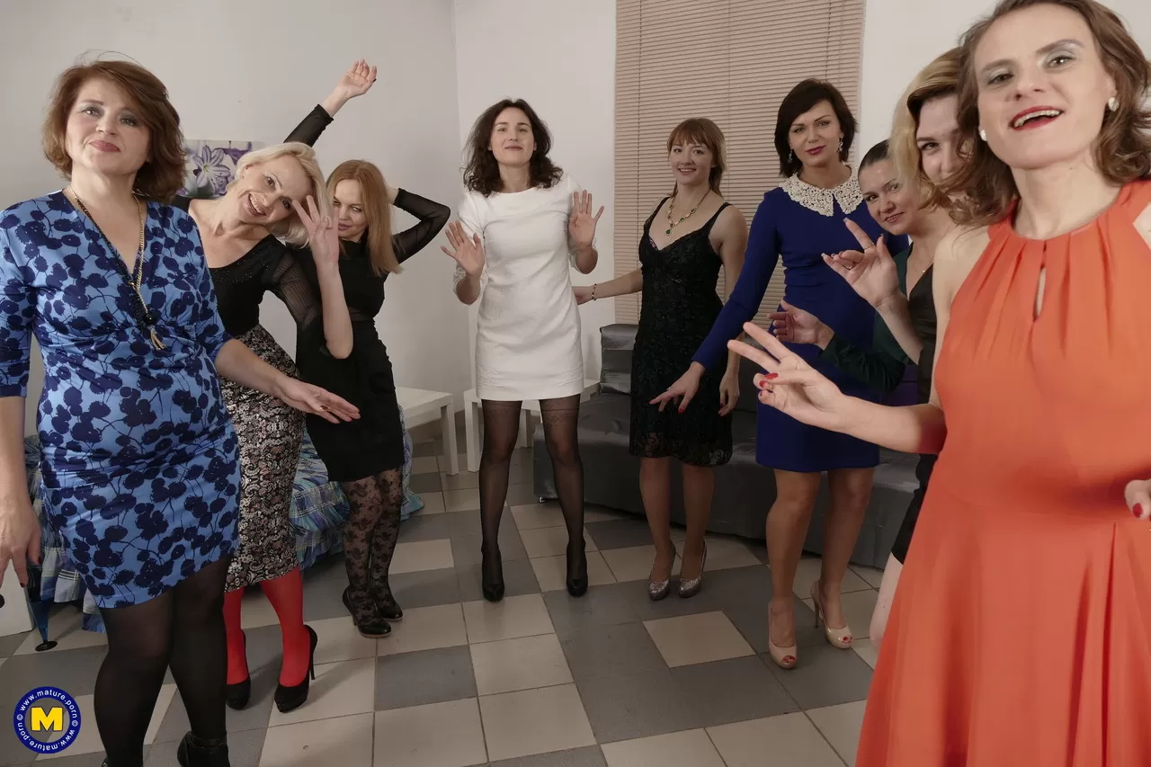 Группа зрелых женщин раздевается до чулок и каблуков перед обратной групповухой