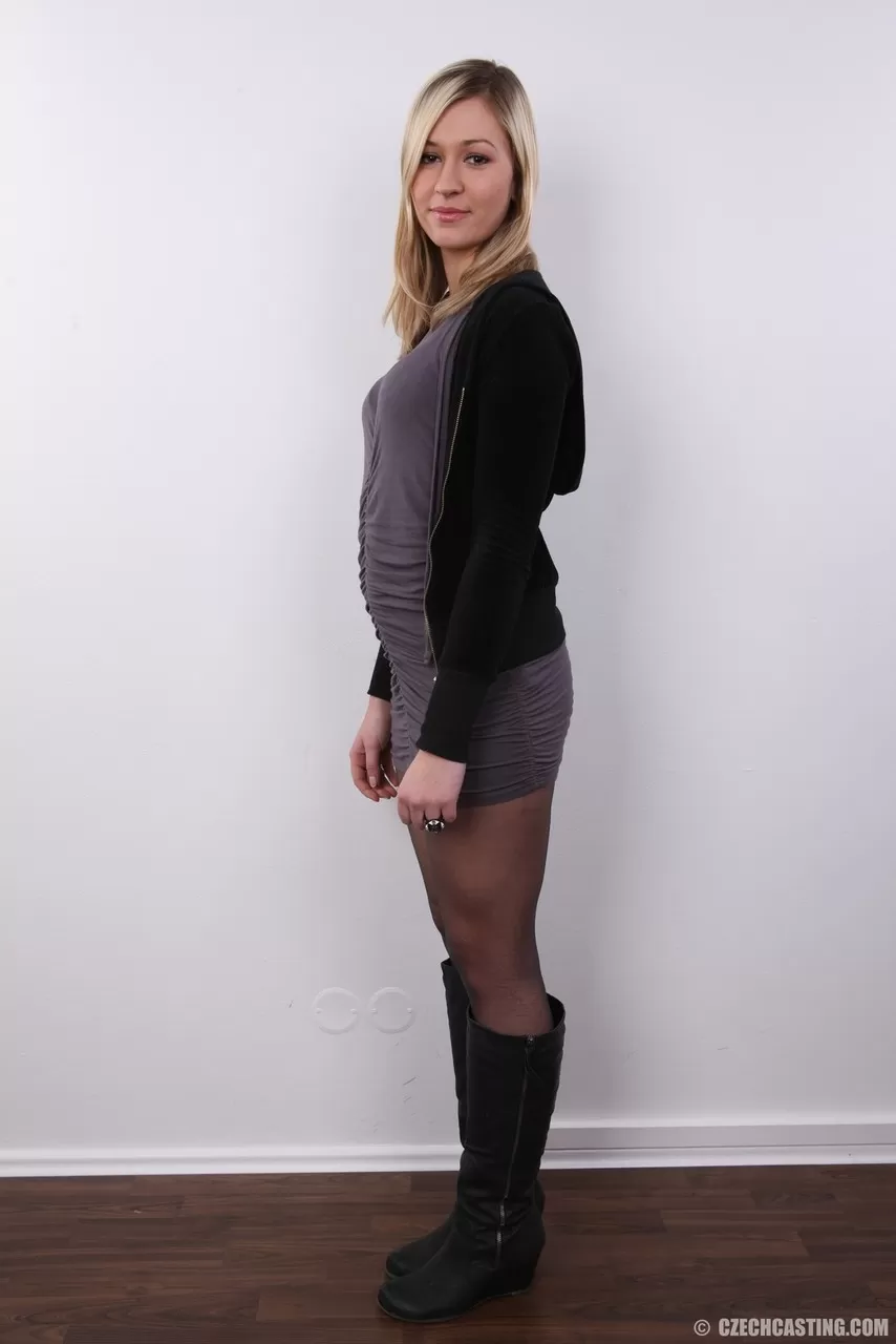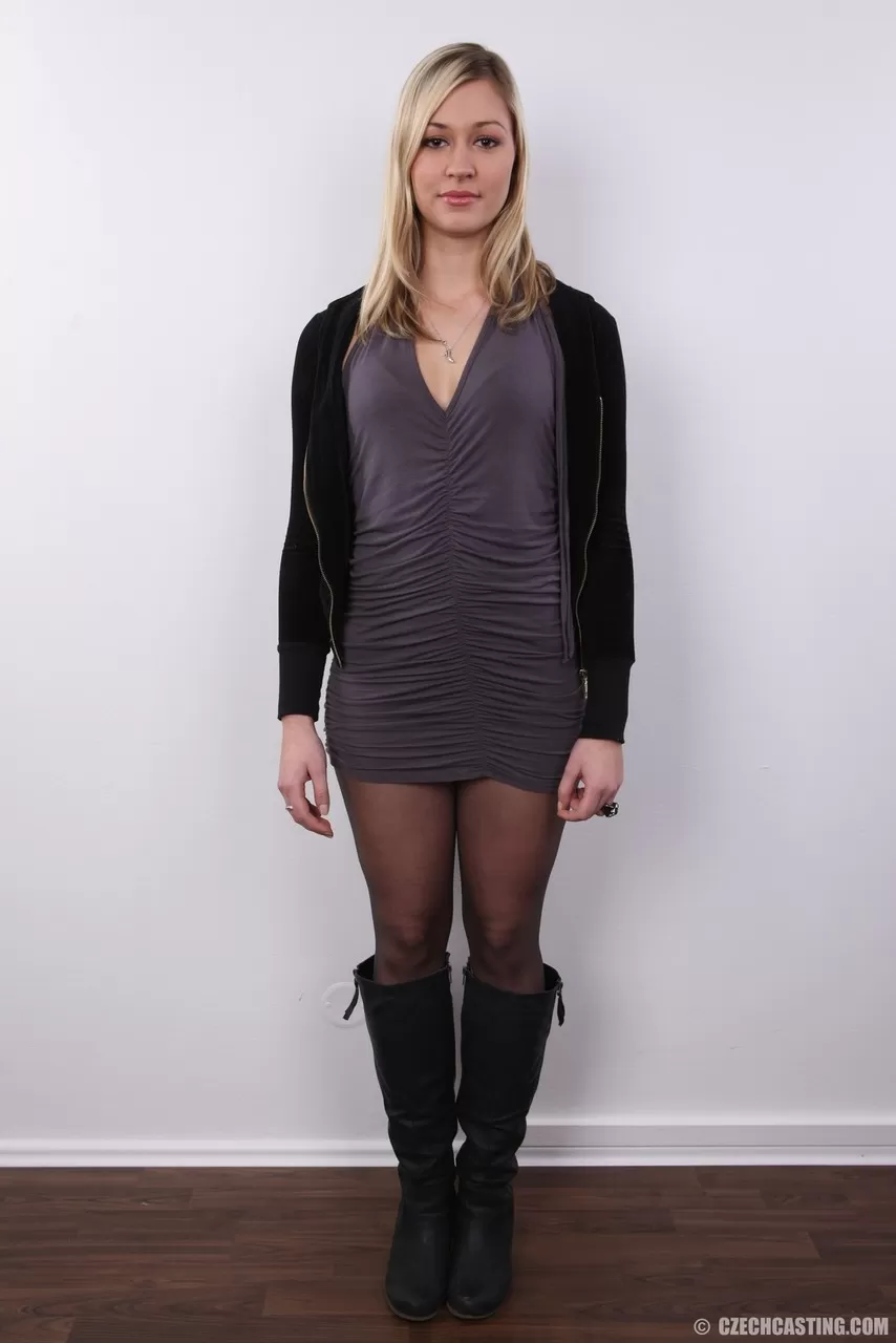 Грязная блондинка-любительница переходит от полностью одетой к стоящей обнаженной настолько, насколько это возможно