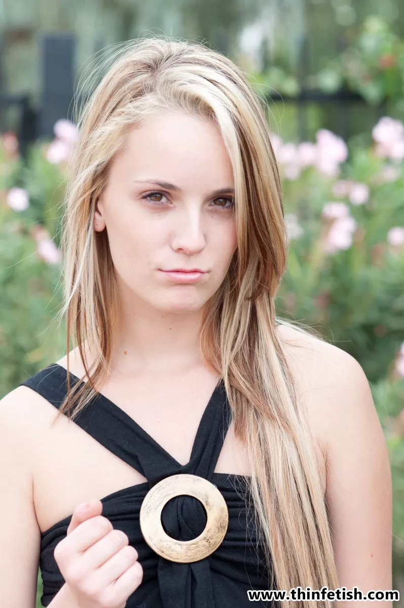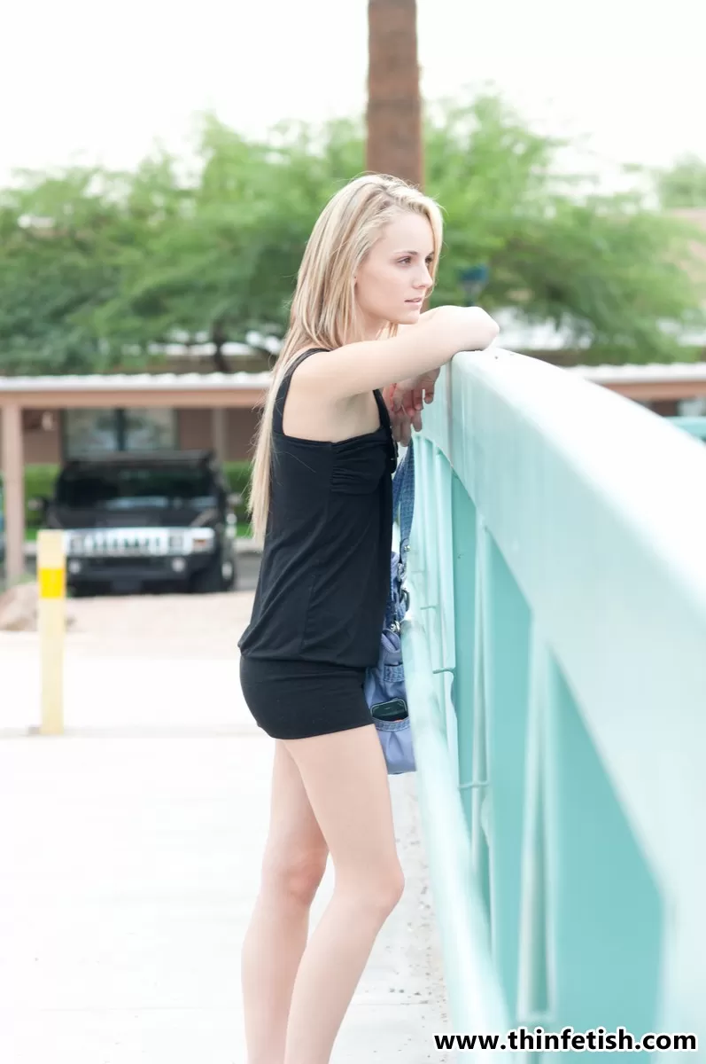 Худенькая блондинка демонстрирует свою киску на публике без трусиков