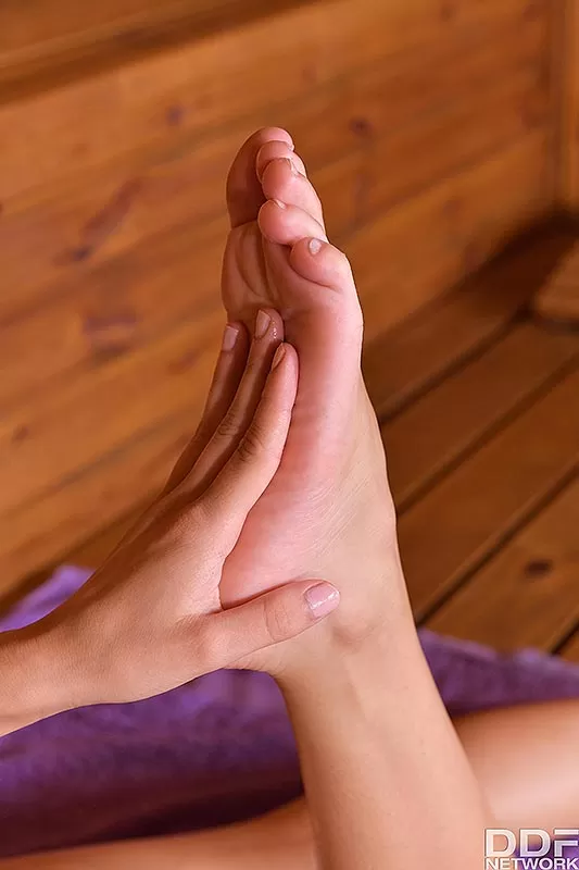 Худенькая молоденькая Никки Фокс трет свои ступни после снятия бикини в сауне