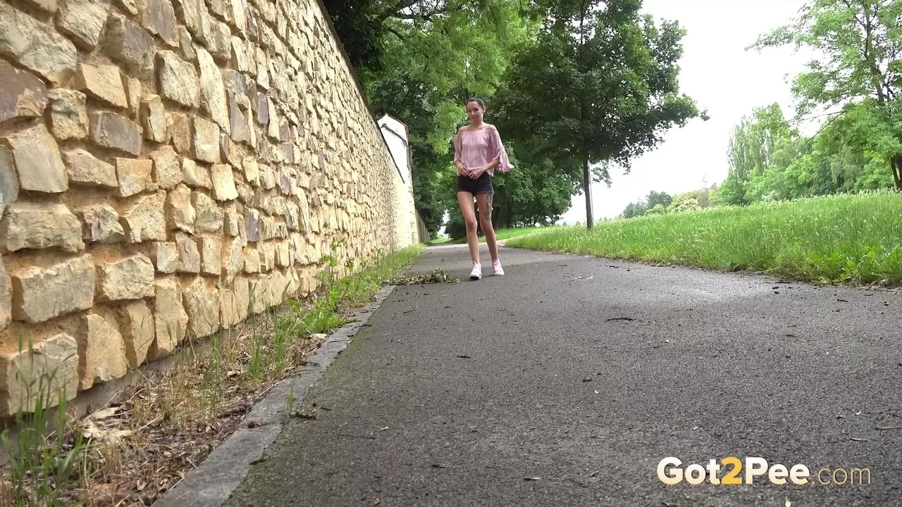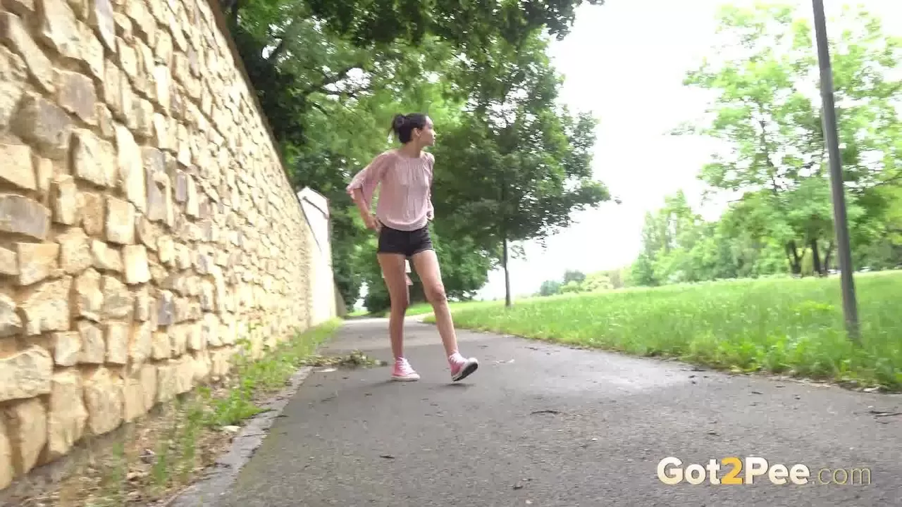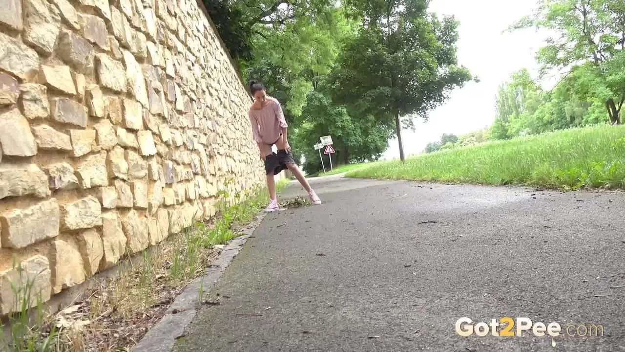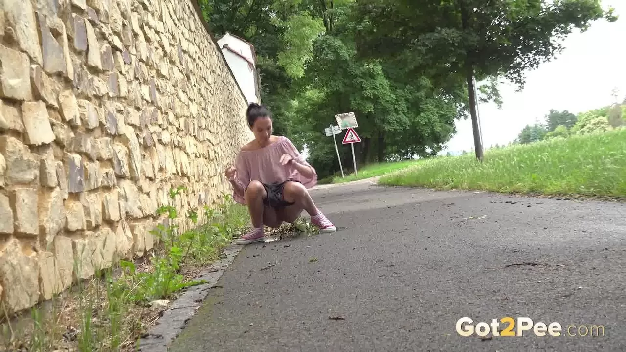Коротко снятая девушка Мистика садится на корточки, чтобы пописать, на мощеной дорожке в городской обстановке