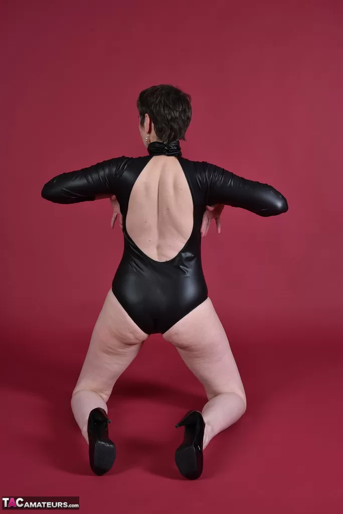 Коротко стриженная брюнетка постарше показывает свою лысую киску, моделируя полностью обнаженной