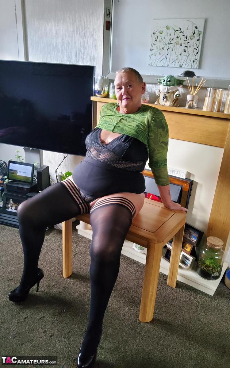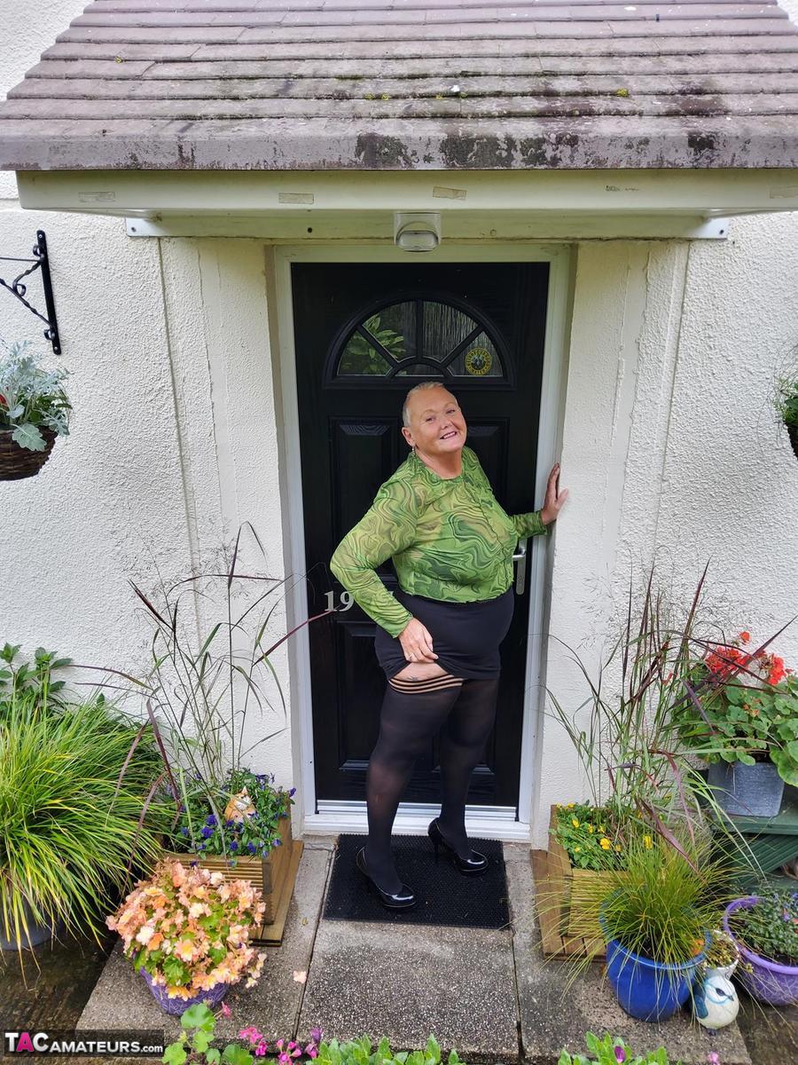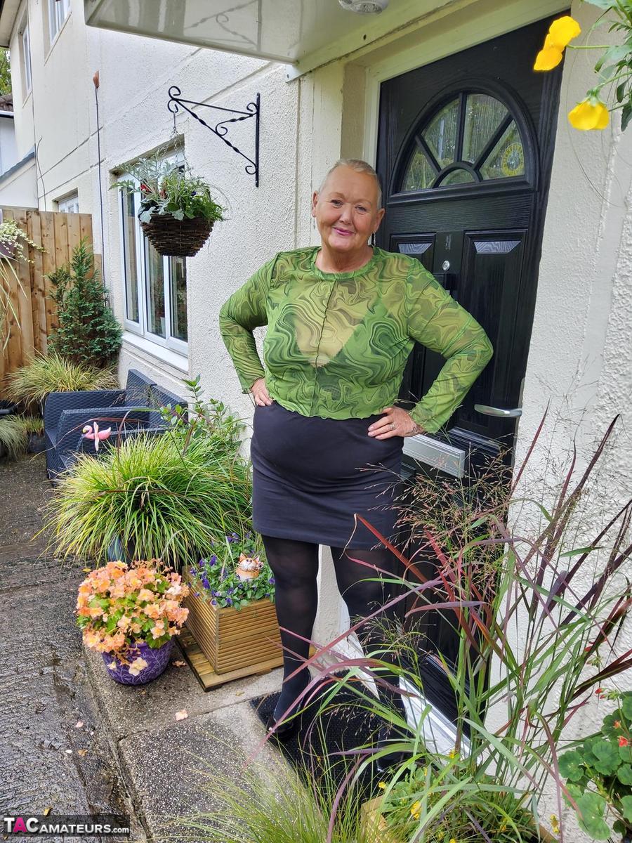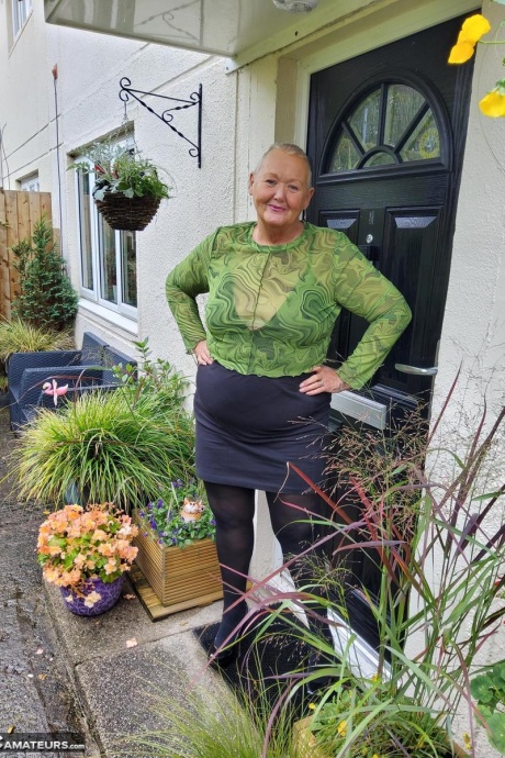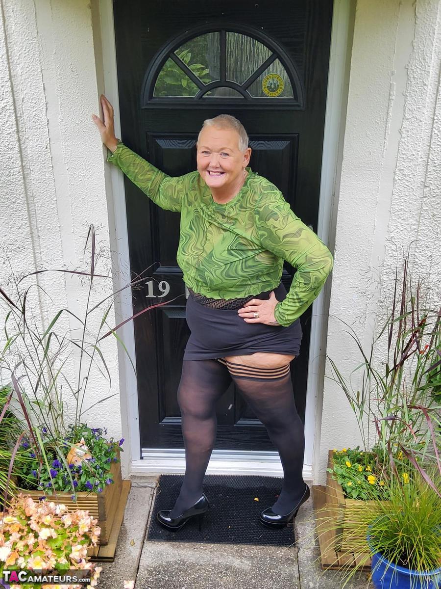 Коротко стриженная Нэн Валгасмик обнажает свои трусики под юбкой в чулках