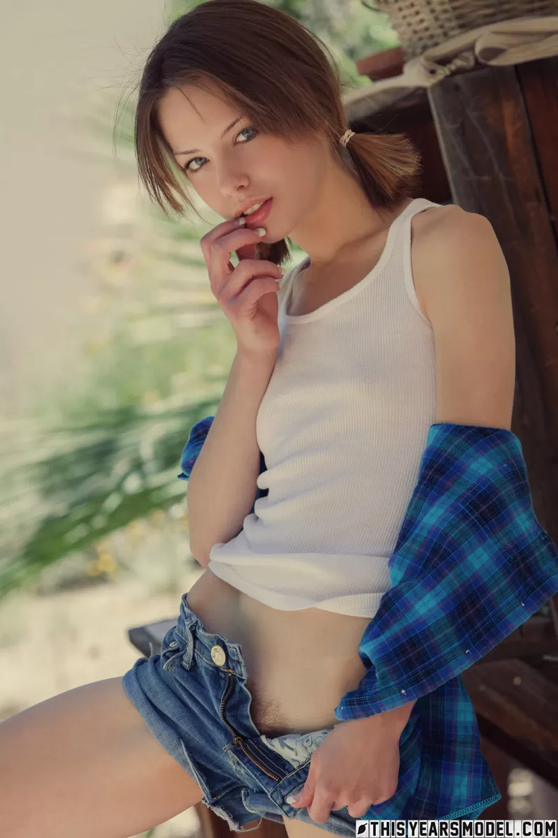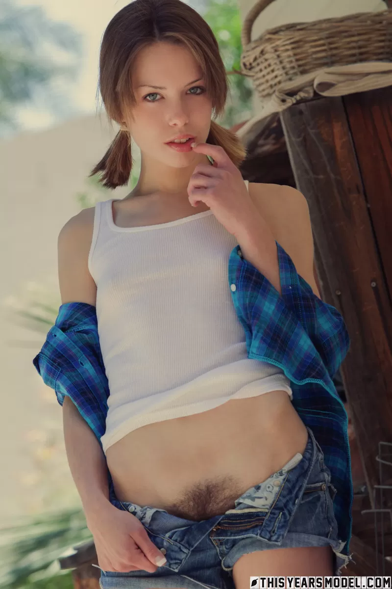 Красивая девушка Бонни обнажает свои крошечные сиськи, прежде чем показать свой подстриженный кустик