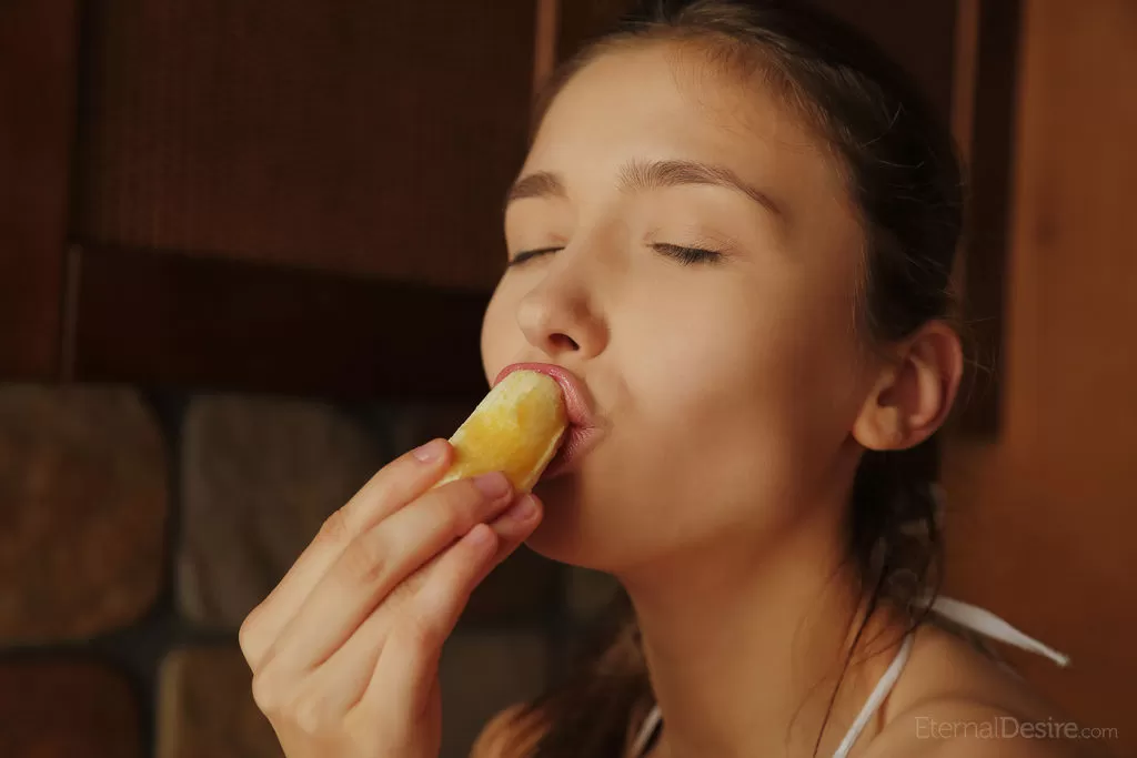 Красивая девушка-подросток показывает свои большие сиськи и лысую пизду, поедая фрукты