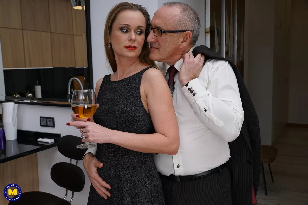 Красивая худенькая домохозяйка лежит на прилавке в черном платье для одетого траха