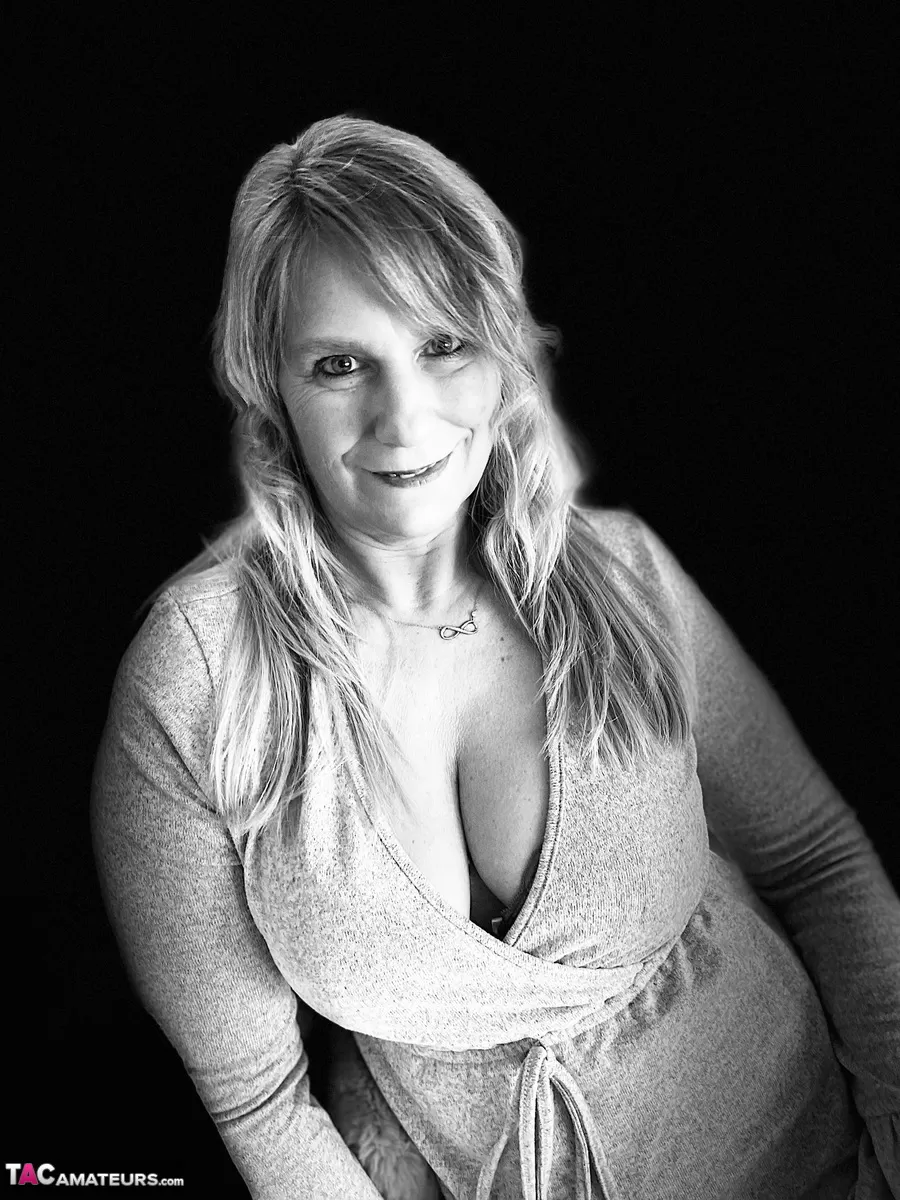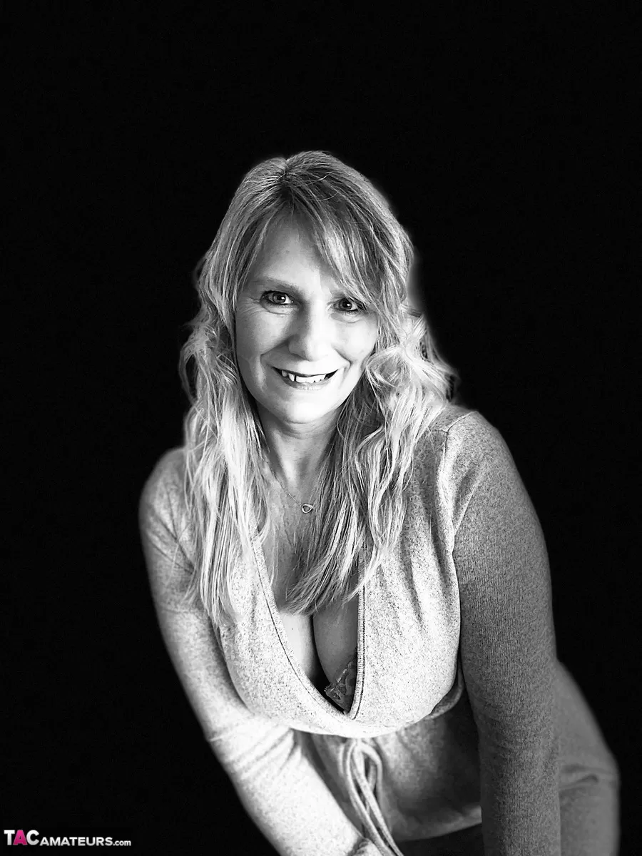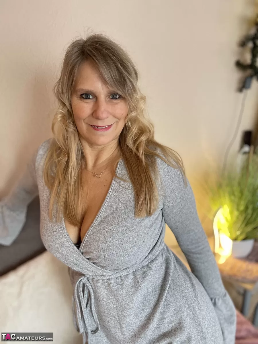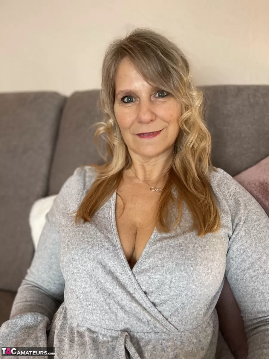 Милая блондинка средних лет Сьюзи играет со своей киской после того, как сняла леггинсы