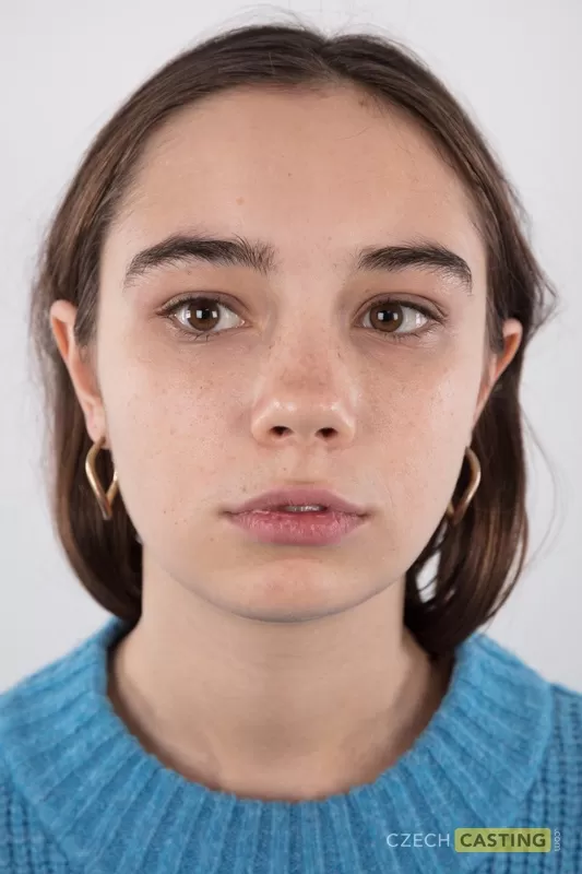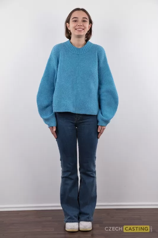 Модель-любитель Ульяна стоит обнаженная, сняв свитер и синие джинсы