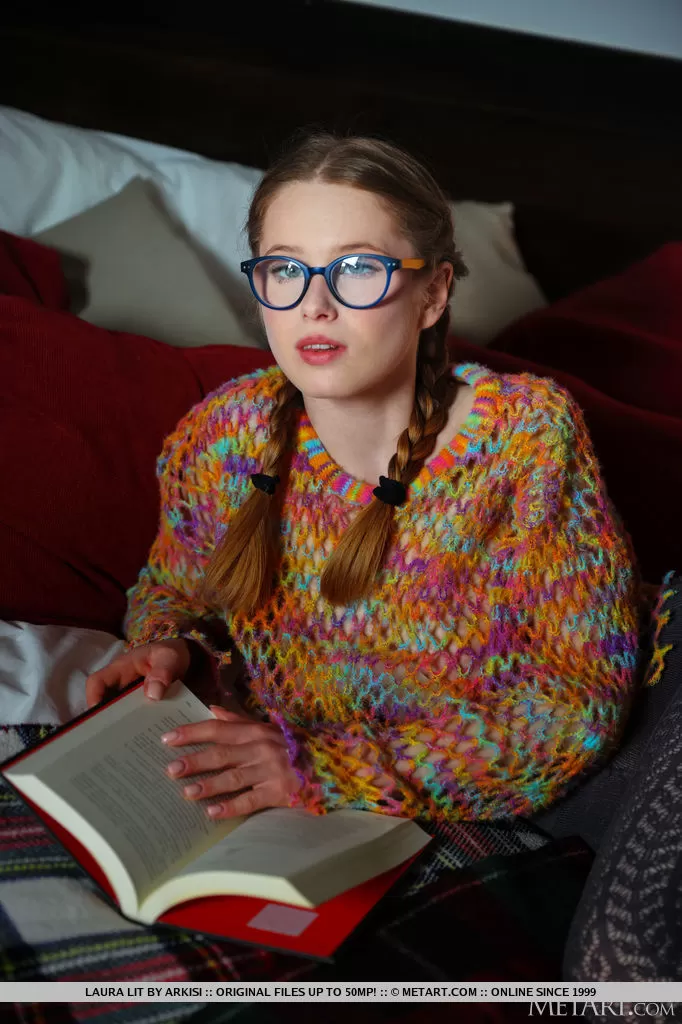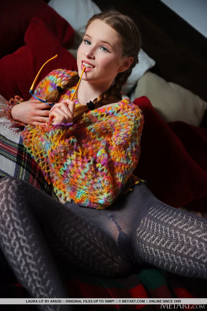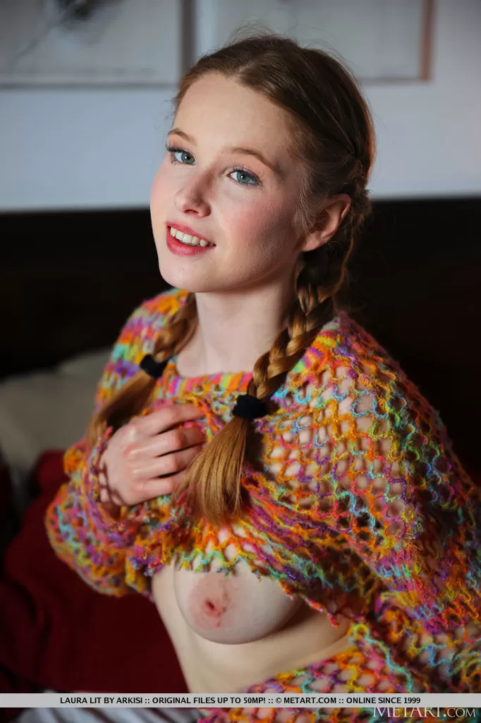 Молодая девушка Лора Лит раздевается догола, ее волосы заплетены в косички