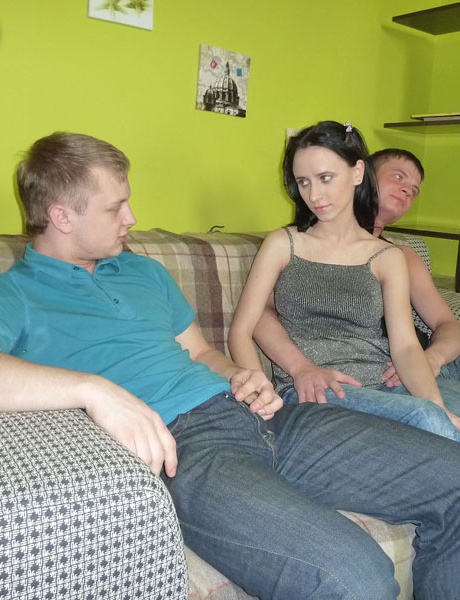 Молодая подружка брюнетка дергает за член своего парня, пока скачет верхом на другом парне