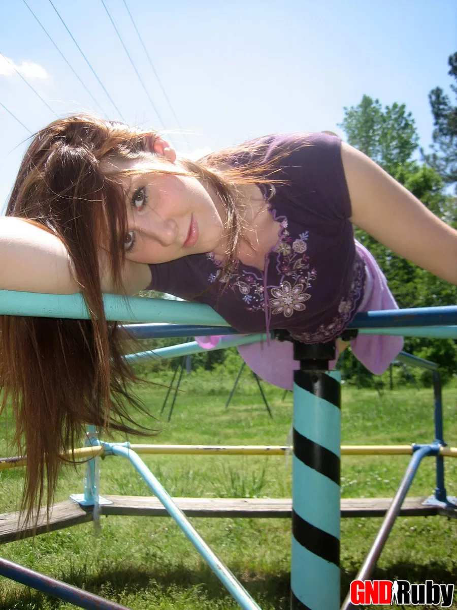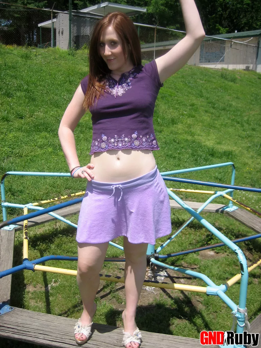 Молодая рыжеволосая красотка демонстрирует свою грудь и трусики на детской площадке
