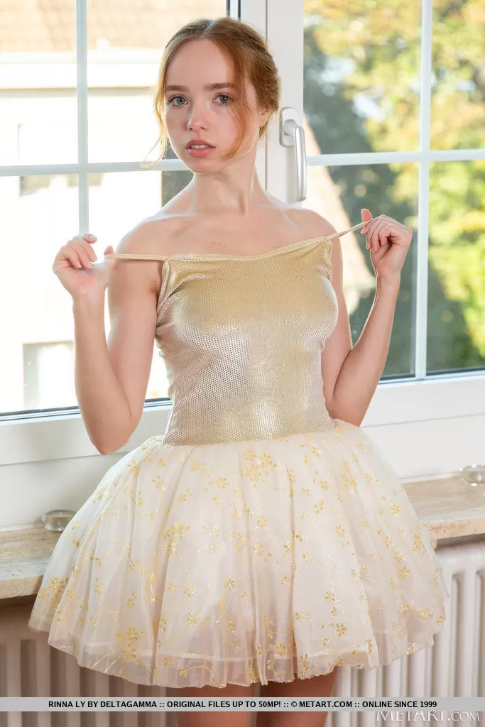 Молодая рыжеволосая Ринна Ли снимает свою одежду балерины, раздеваясь догола