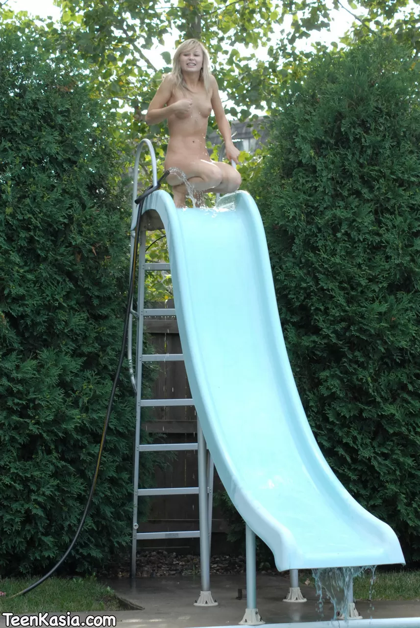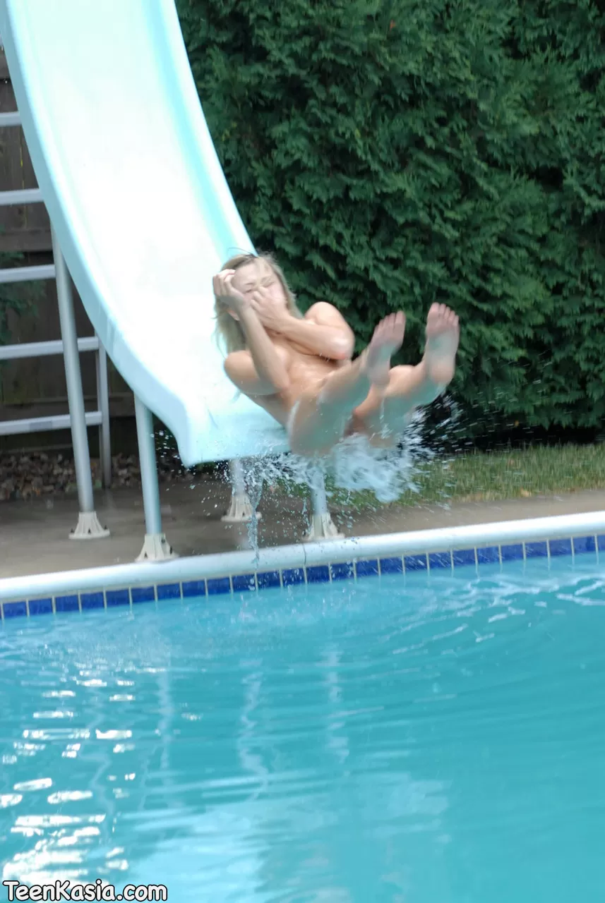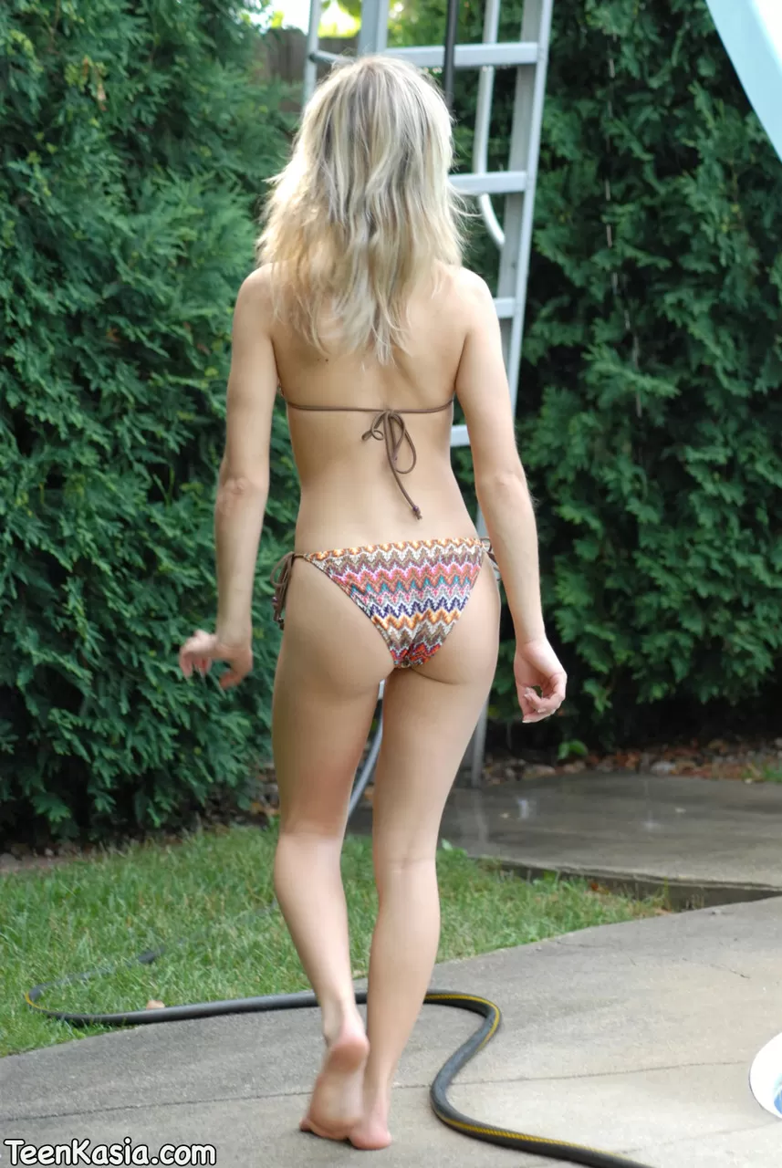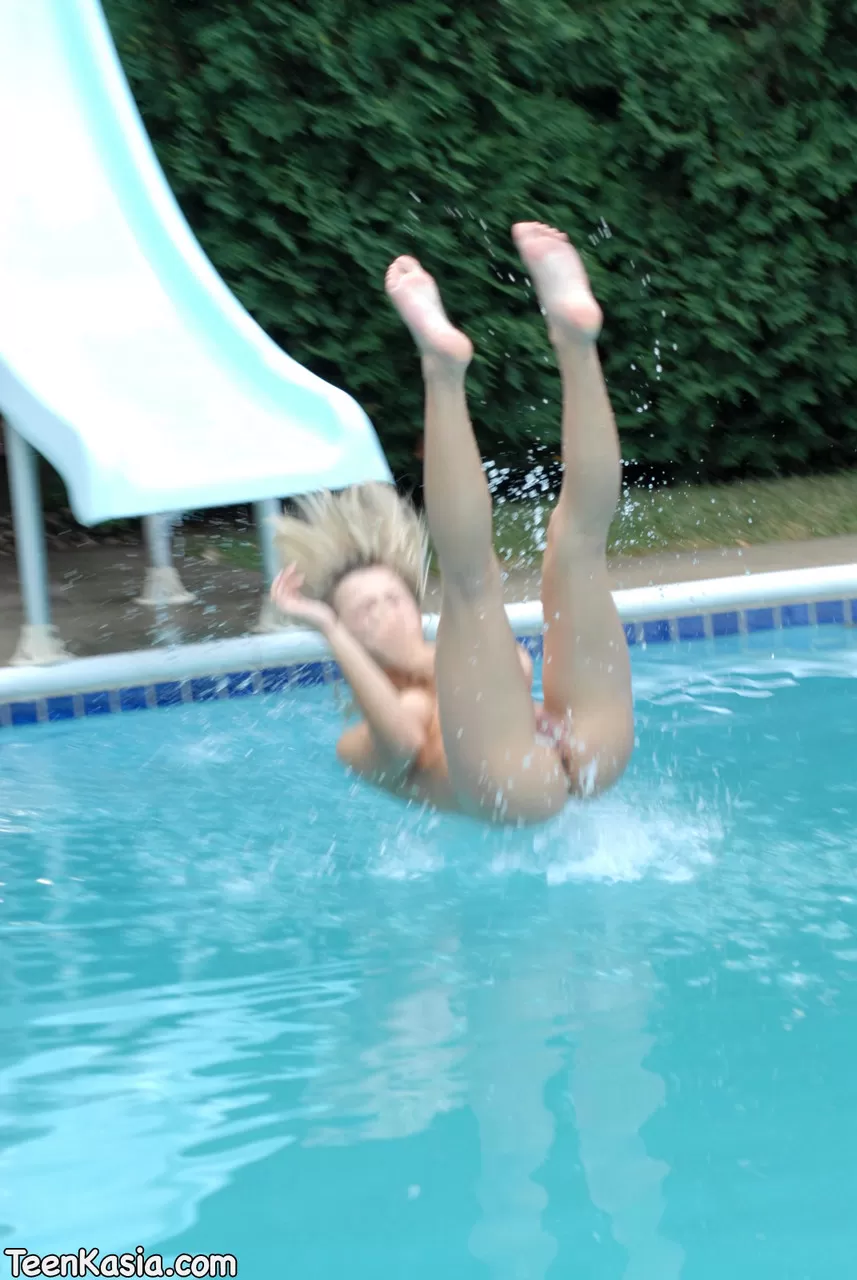 Молоденькая блондинка Кася снимает бикини перед тем, как нырнуть в воду обнаженной