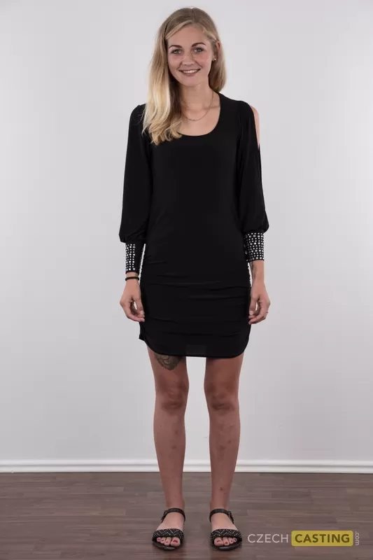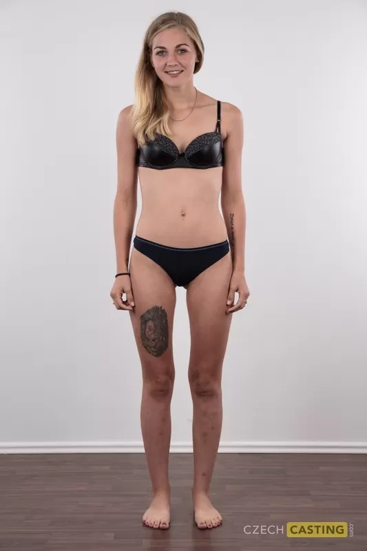 Молоденькая блондинка Марсела показывает свои очень крошечные сиськи в черных стрингах