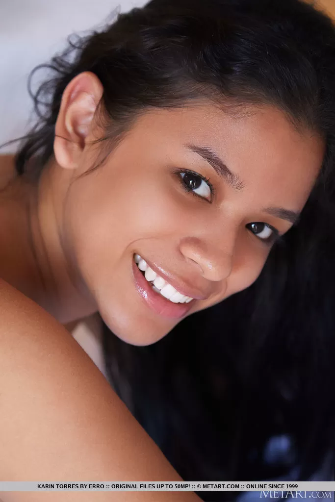 Молоденькая латиноамериканка Карин Торрес показывает свою красивую пизду после того, как разделась догола на кровати