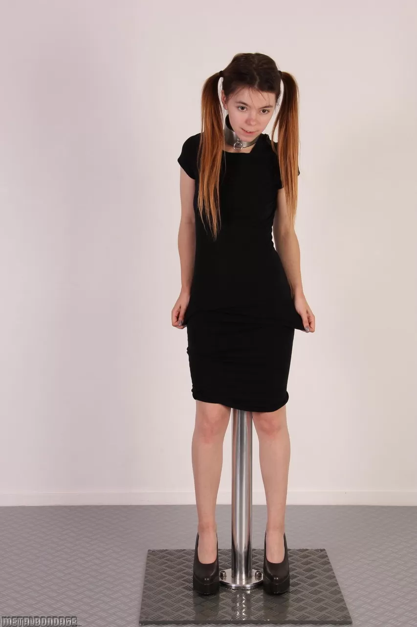 Молоденькая Лина Розелина в ошейнике насаживает свою киску на регулируемую подставку для фаллоимитатора