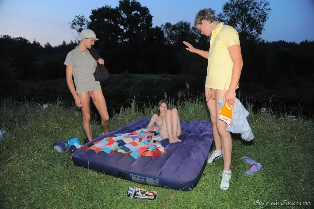 Молодо выглядящая девушка Оксана теряет свою девственность с двумя парнями в поле
