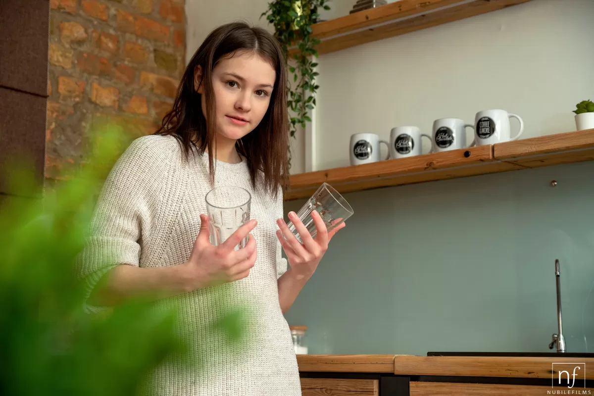 Молодо выглядящая девушка занимается сексом со своим парнем на кухне