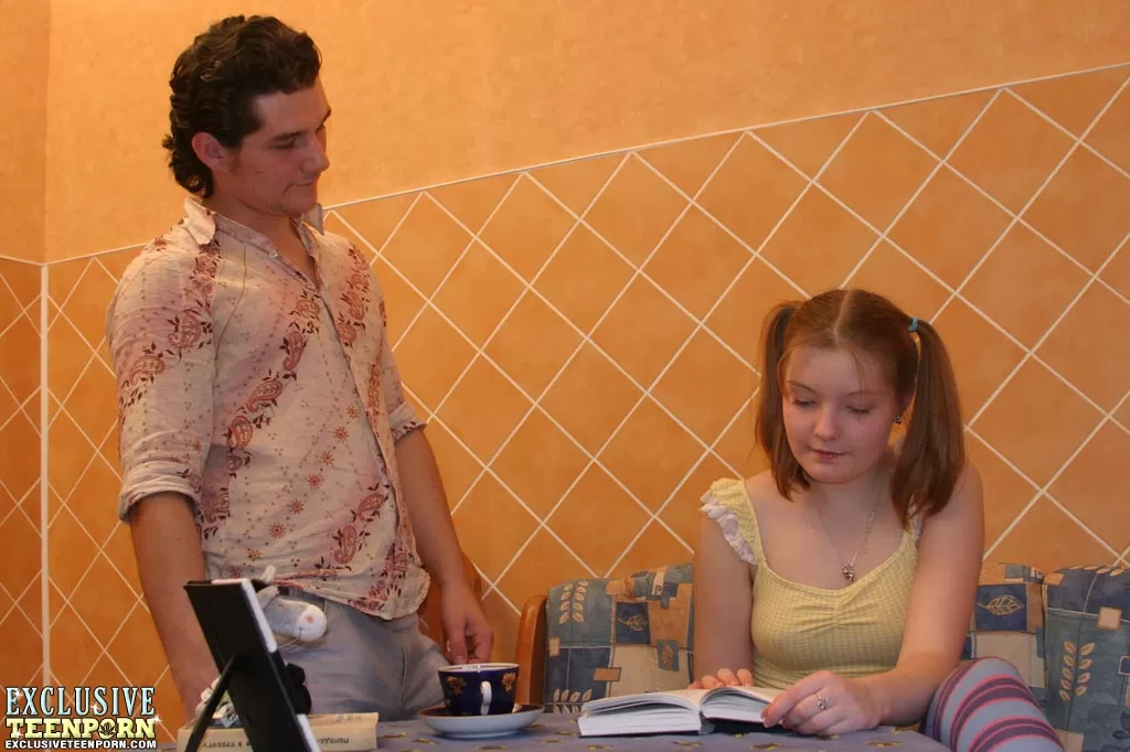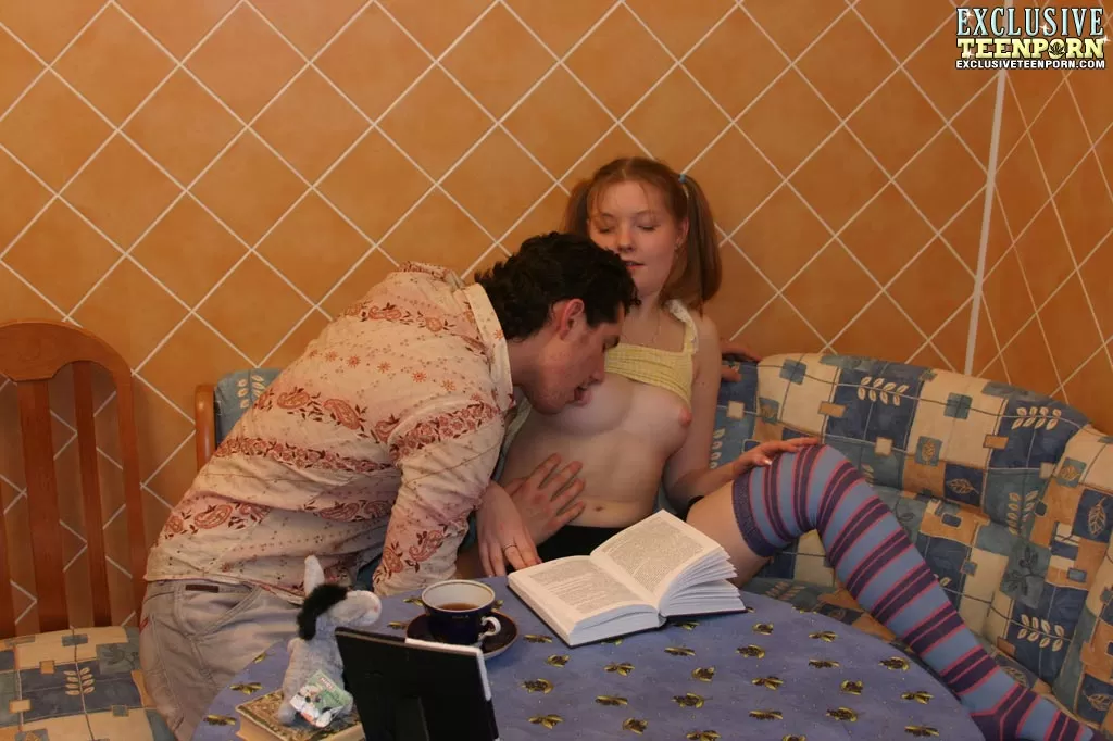 Молодо выглядящая рыжеволосая Анна занимается сексом со своим парнем в гольфах выше колена