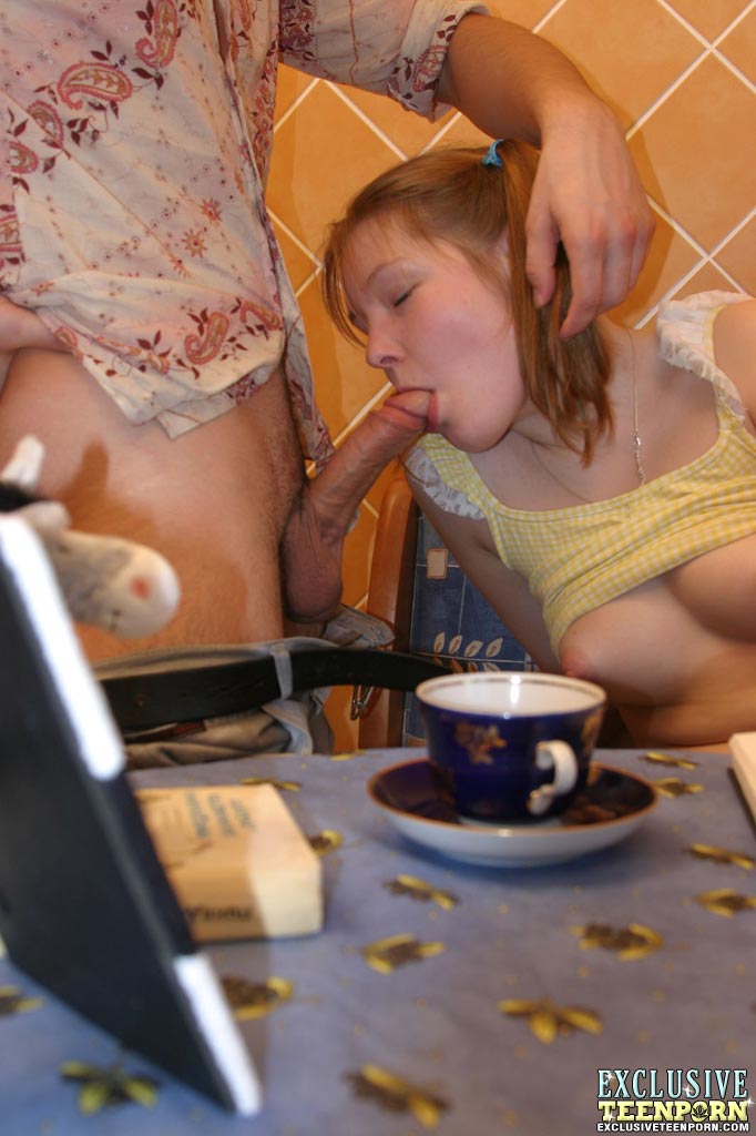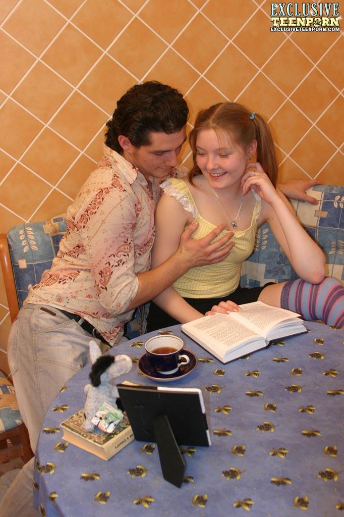 Молодо выглядящая рыжеволосая красотка берет его в попку в длинных носках и с косичками