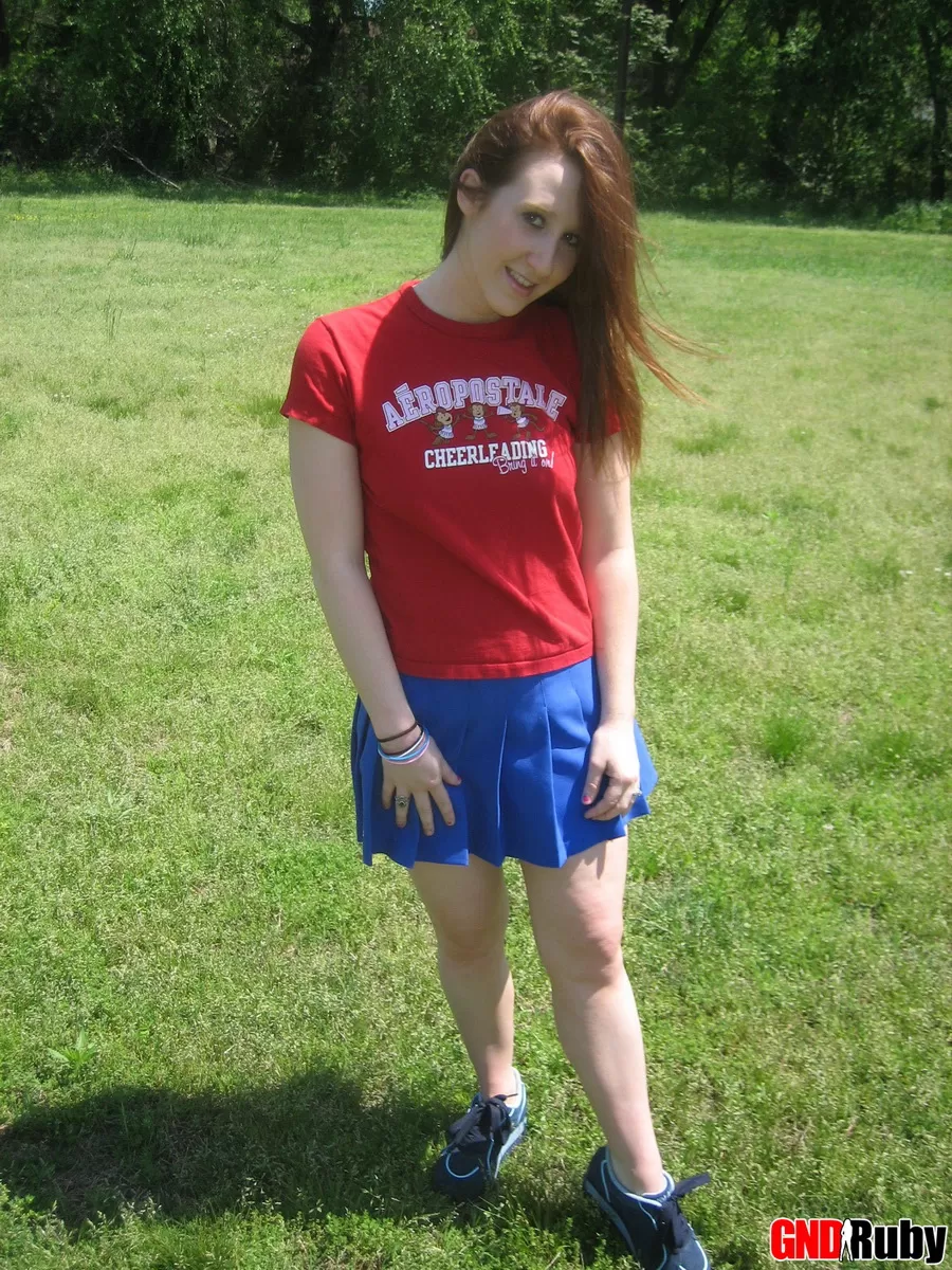 Молодо выглядящая рыжеволосая красотка демонстрирует свои сиськи и нижнее белье на футбольном поле