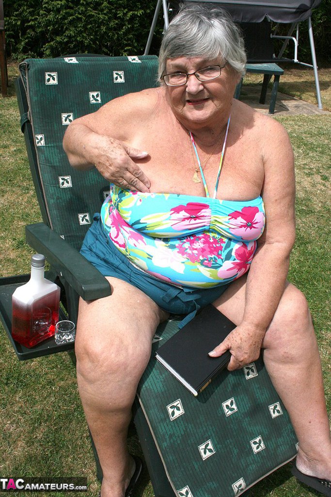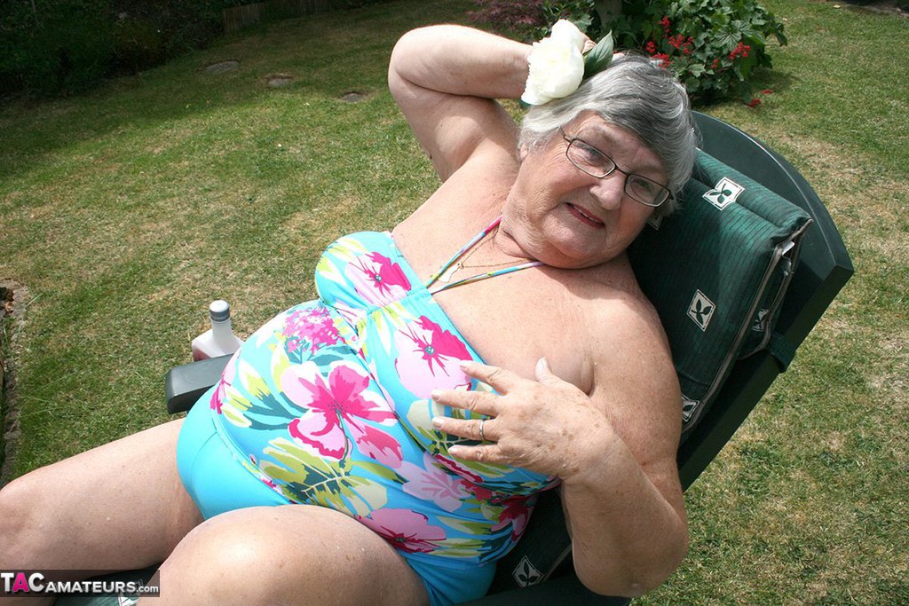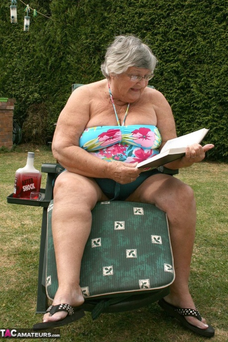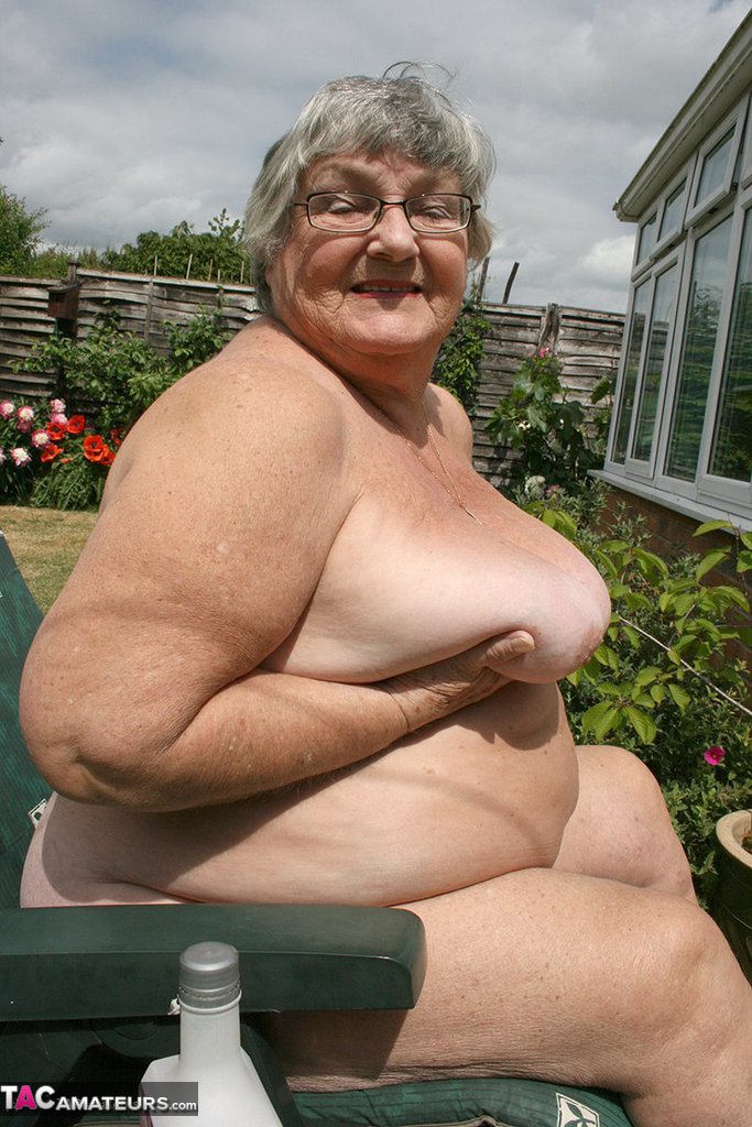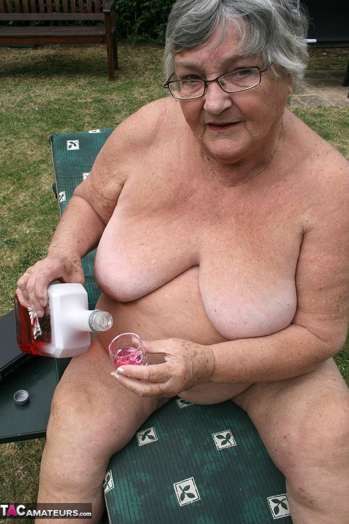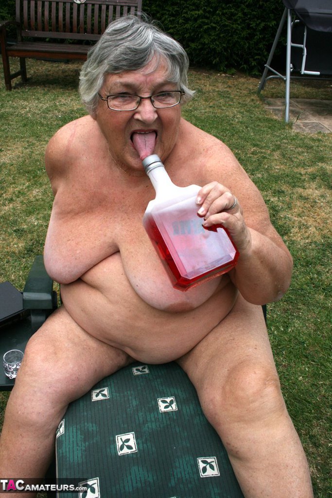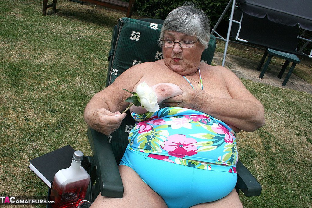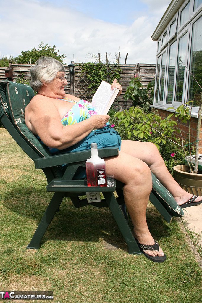 Непослушная любительская бабуля Либби вставляет бутылку в свою толстую киску в саду