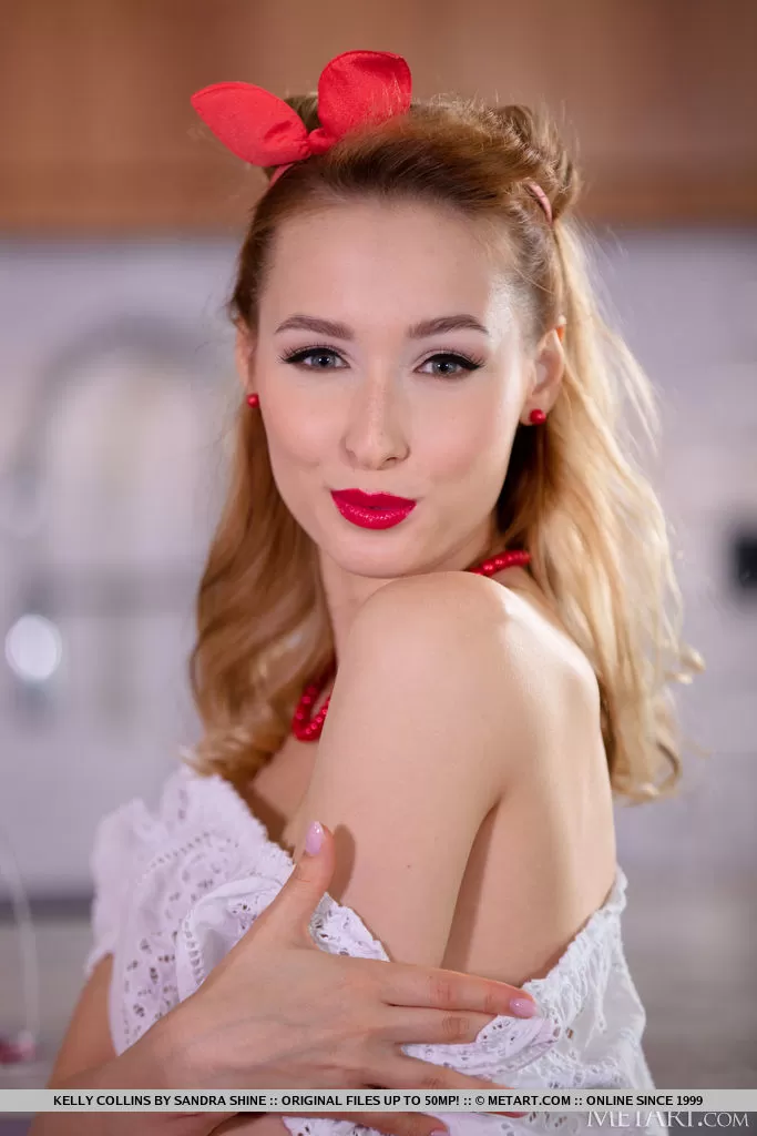 Очаровательная молоденькая Келли Коллинз раздевается догола в белых носках с оборками и красных туфлях на каблуках