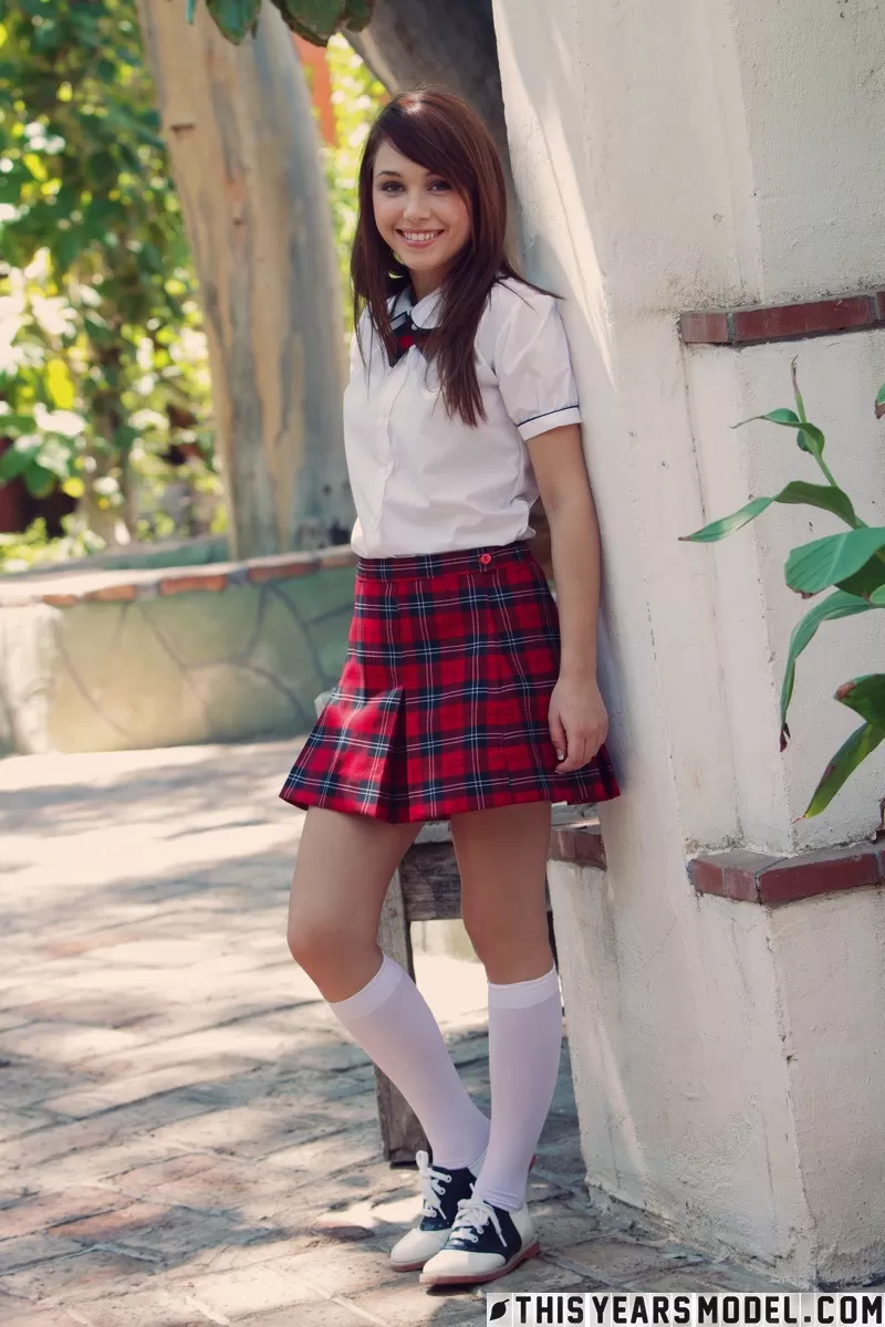 Очаровательная студентка Марисса Мэй раздевается в саду в белых носках