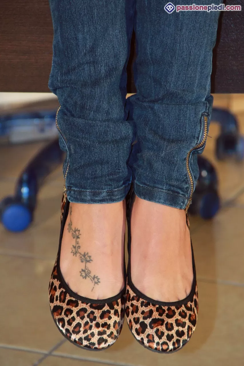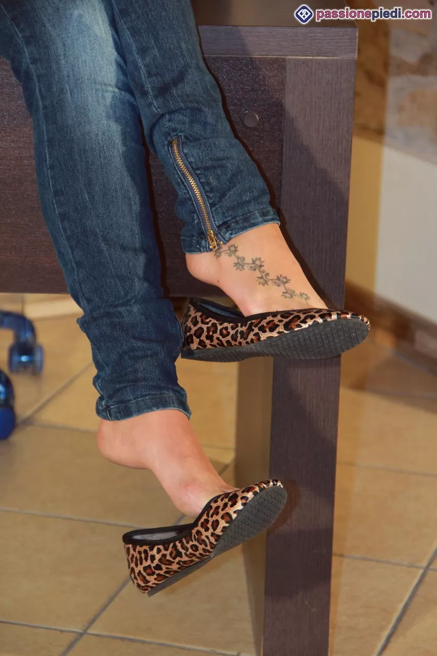 Одинокая девушка в джинсах и куртке освобождает босые ноги от туфель на плоской подошве